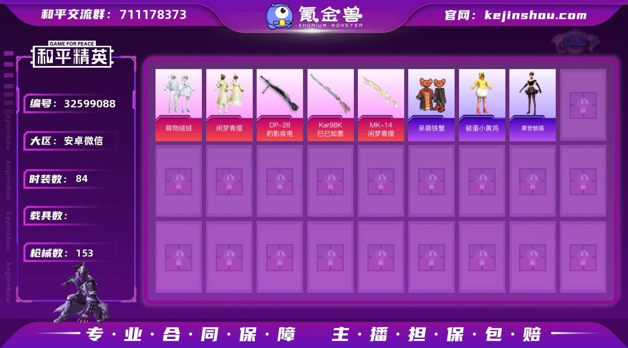 HJ6670 可二 53级 1稀有3粉装4特效枪99套装153枪皮 2印记 【1稀有】 AKM-缤纷海域 【3粉装】 异瞳寒姬 闲梦青缨 萌物绒绒 【4特效枪】 Kar98K-巳巳如意 (5级) DP-28-豹影疾电 (5级) Mk14-闲梦青缨 (7级) Mk14-福马献瑞 (5级) 【7热门】 小丑鱼 龟仙人 呆萌铁蟹 迅捷狂鲨 深海小丑鱼 破蛋小黄鸡 弄潮海豚 【1飞行器】 萌物绒绒飞行器 【1头盔】 深海小丑鱼头盔 【1背包】 深海小丑鱼背包