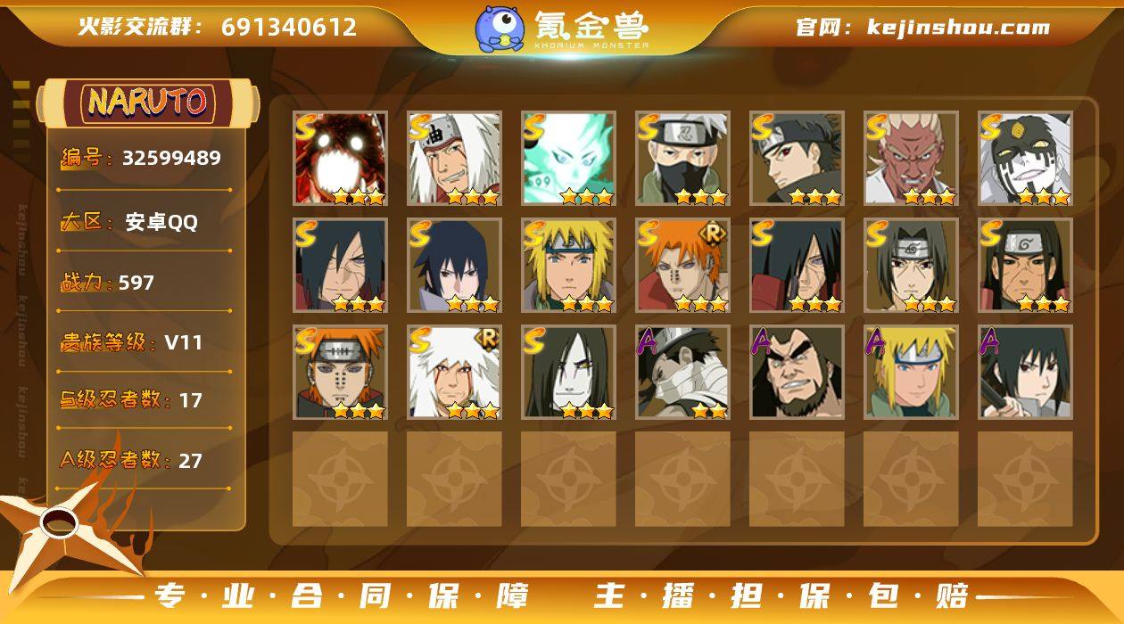 【火影忍者】战斗力:597W+;段位:见习1阶;本服排名:1691;VIP:V11级;S忍:17个;A忍:27个;通灵兽:14个,S忍:秽土转生解宇智波斑|须佐能乎旗木卡卡西|超佩恩天道|天道佩恩|传说中的三忍自来也|须佐能乎宇智波止水|秽土转生千手柱间|永恒万花筒宇智波佐助|最终章大筒木舍人|忍界大战艾|舞之豪杰自来也|大蛇丸(普通)|波风水门|秽土转生宇智波斑|须佐能乎宇智波鼬|大筒木桃式|暴怒第六尾漩涡鸣人__A忍:忍界大战李洛克|秽土转生角都|忍界大战日向宁次|青年长门|秽土转生迪达拉|青年波风水门|青年艾|须佐能乎宇智波佐助|九尾查克拉漩涡鸣人|火影继承人猿飞日斩|万花筒写轮眼宇智波佐助|死司凭血飞段|疾风传我爱罗 * 3星|飞段(普通)|仙人模式漩涡鸣人|迈特凯(普通) * 4星|宇智波鼬(普通)|干柿鬼鲛(普通) * 3星|秽土转生桃地再不斩|绯流琥蝎|蝎(普通)|猿飞阿斯玛(普通) * 3星|桃式显现漩涡博人|六代目水影长十郎|不缘|宇智波泉奈|羁绊神农__通灵兽:砂之守鹤|忍犬(普通)|蓝蛇|蛤蟆吉|忍龟|镰鼬|猿魔|山椒鱼|蜃|蛤蟆仙人|鲛鲨|蛤蟆健|乌鸦(普通)|蛤蟆龙