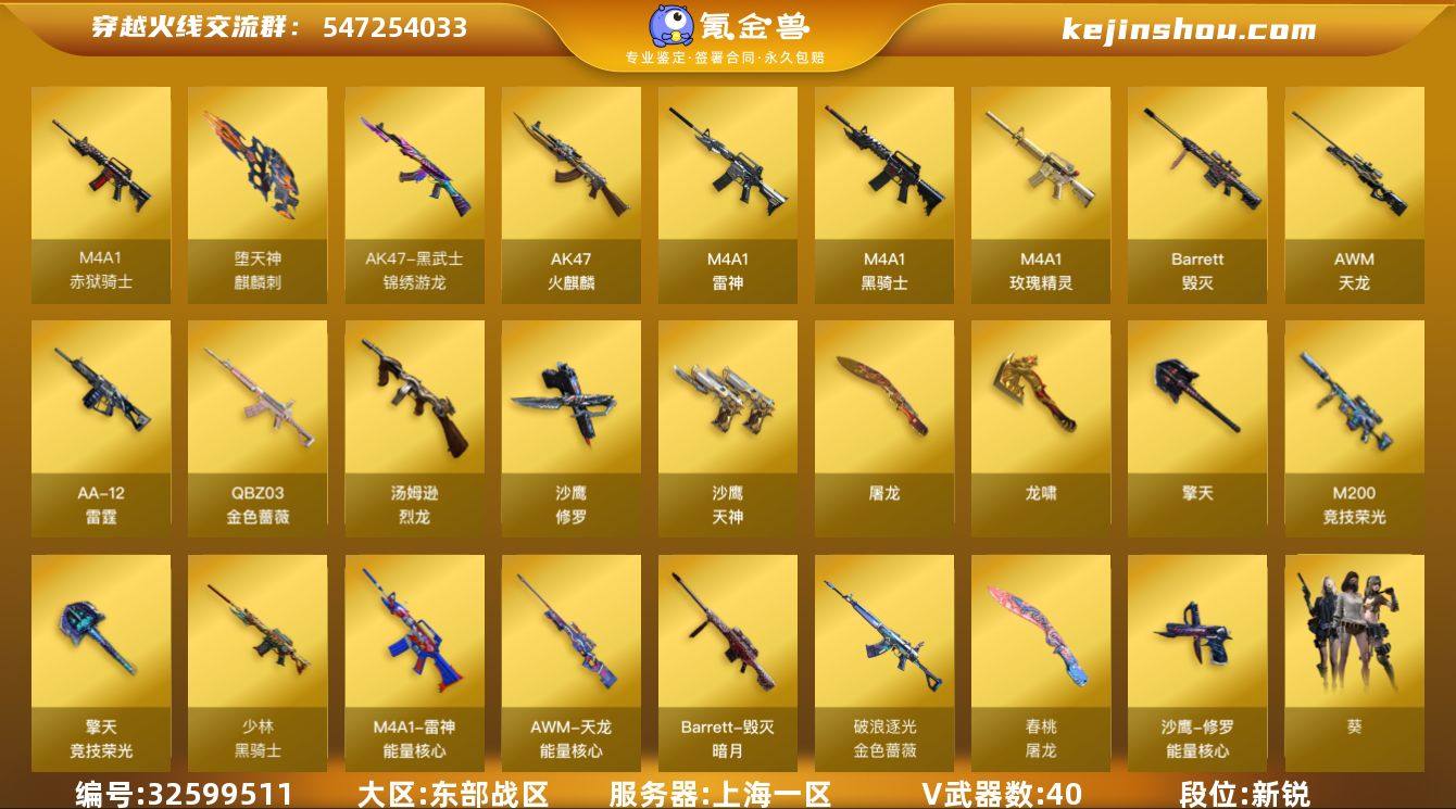 上海一区-43V-0王者-0炫金 【热门武器】:QBZ03-金色蔷薇*2,M200-竞技荣光,M4A1-黑骑士,汤姆逊-烈龙,沙鹰-修罗*3 【音效卡】:死神-雪域霜狐-怀旧音效卡 【皮肤】:金色蔷薇-破浪逐光 皮肤,雷神-能量核心,雷神-源计划2.0专属 皮肤,雷神-化蛇 皮肤,毁灭-暗月,毁灭-英雄计划 皮肤,黑骑士-少林,天龙-能量核心,修罗-能量核心,屠龙-春桃 皮肤,屠龙-破浪逐光 皮肤,轻型军用手斧-再燃火线 【角色】:葵,关小雨,雪域霜狐,暗夜-X,芳心审判者,飞虎队-X,嘉年华灵狐,零-水下丽影,灵狐者-黄金海岸,麻雀,潘多拉-X,潘多拉-甜心教官,铁骑荣耀,兔囡囡,铁扇公主-暗灵,樱-战斗天使 【人偶武器】:迷你波特博士*5,迷你曼提柯尔,夺魂,迷你火种*4,深渊终结者手雷 【暴走生化】:超级对讲机 【挑战大师】:冰龙粉碎者-白马银枪,激光毁灭者III-白马银枪*2,试炼破坏者III 【英雄级武器】:AK47-火麒麟,M4A1-雷神*2,M4A1-黑骑士,黑武士-锦绣游龙,M4A1-玫瑰精灵,QBZ03-金色蔷薇*2,AWM-天龙,Barrett-毁灭,M200-竞技荣光,汤姆逊-烈龙,AA-12-雷霆,沙鹰-修罗*3,沙鹰-天神,屠龙*2,龙啸,麒麟刺-堕天神,擎天,擎天-竞技荣光,高爆手雷-堕天神,高爆手雷-竞...