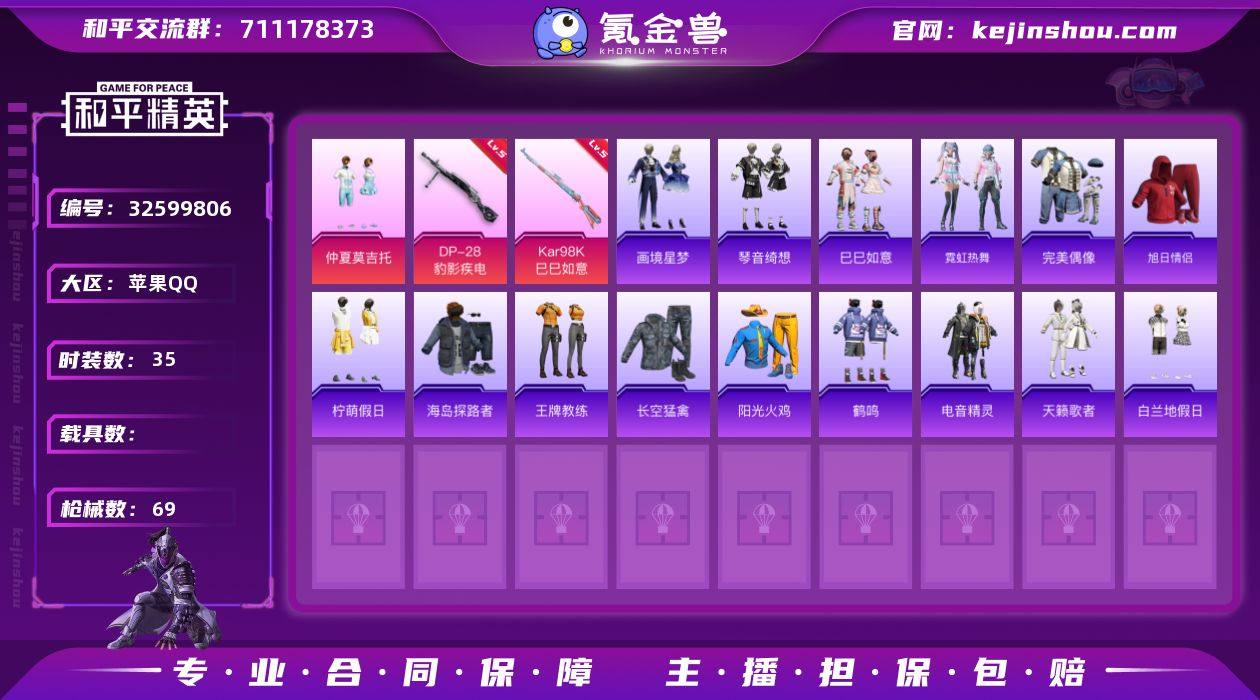 TD263229无二次苹果 手Q-1粉装-3特效枪-0载具-0粉色飞行器-16613热力值-1王牌印记-35套装-69枪皮 【粉色套装】:粉装-仲夏莫吉托 【粉色枪皮等级】:Kar98K-巳巳如意(五级),Mk14-福马献瑞(五级),DP-28-豹影疾电(五级) 【粉色枪皮】:Kar98K-巳巳如意,Mk14-福马献瑞,DP-28-豹影疾电 【粉色降落伞】:洛神天依降落伞,冷漠罗丽降落伞,异瞳寒姬降落伞,炫彩糖果降落伞 【稀有套装】:套装-巳巳如意,套装-雪国风尚,套装-马上有钱,套装-迅捷龙虾,套装-霓虹热舞,套装-画境星梦,套装-琴音绮想 【稀有枪皮】:AKM-龙的传人,SCAR-L-炫彩节奏,M416-蓝色火焰,AUG-耀粉歌者,QBZ-彩虹符号,QBZ-洛神天依,M762-天降萌叽,M762-彩虹符号,Mk47-洛神天依,G36C-星穹咏叹调,ACE32-画境星梦,UZI-啾咪啾咪,UZI-天降萌叽,UMP45-仲夏莫吉托,Vector-生命誓言,汤姆逊-像素花束,MP5K-画境星梦,P90-巳巳如意,M24-炫彩节奏,M1加兰德-画境星梦,S686-巳巳如意,S12K-极意拳锋,DBS-第五大道,AA12-G-画境星梦,MG3-幻世战舞者,R45-幻彩电音,平底锅-画境星梦,破片手榴弹-巳巳如意 【其他套装】:套装-完美偶像,套装-旭日情侣,套装-柠萌假日,套装-海岛探路者,套装-王牌教...