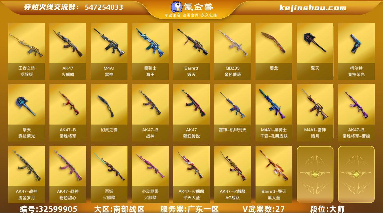 【ky5483】广东一区-31V-1王者武器数-0炫金武器数 【热门武器】:QBZ03-金色蔷薇 【皮肤】:雷神-暗月,雷神-烈虎皮肤,雷神-机甲刑天皮肤,火麒麟-AG战队皮肤,火麒麟-平天大圣,火麒麟-百城,火麒麟-心动糖果,毁灭-黑大圣皮肤,毁灭-神秘黑洞皮肤,毁灭-英雄计划 皮肤,M4A1-千变-孔明皮肤,战神-粉色甜心皮肤,战神-流金岁月皮肤,AK47-B-常胜将军-曹操 【角色】:初恋灵狐,芳心审判者,嘉年华灵狐,娟娟,灵狐者-X,灵狐者-黄金海岸,灵狐者-七夕宝贝,龙儿-小淘气,麻雀,潘多拉-X,潘多拉-甜心教官,斯沃特-X,蜀雪,雪莉杨-摸金校尉,樱-战斗天使 【人偶武器】:AWM-灵狐-15周年嘉年华,迷你牛魔王,夺魂,闪光弹-貂蝉,迷你艾比,迷你巨石泰坦-魔花研究所,灵狐娃娃手雷*2 【挑战大师】:激光毁灭者III-白马银枪,试炼破坏者III 【英雄级武器】:AK47-火麒麟*2,M4A1-雷神,QBZ03-金色蔷薇,王者之势-觉醒版,AK-47-猩红传说,AK47-B-战神,黑骑士-海王*2,AK47-B-常胜将军,Barrett-毁灭,柯尔特-竞技荣光,屠龙,擎天,幻灵之锋,擎天-竞技荣光,高爆手雷-竞技荣光*3,闪光弹-幻灵,闪光弹-竞技荣光*2,烟雾弹-竞技荣光 【道具】:超级背包,绿色巨人,灵魂忍者*2...