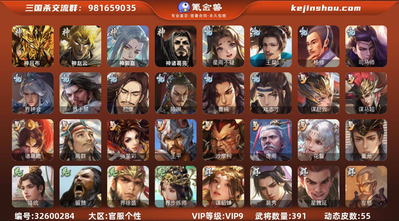 【304】官阶:大将军;VIP等级:VIP9;史诗武将数量:44;动态皮肤数量:55;武将总数:391;史诗宝珠数量:0;将魂数量:1478;神将:6;魏国史诗武将:16;蜀国史诗武将:10;吴国史诗武将:4;群史诗武将:17