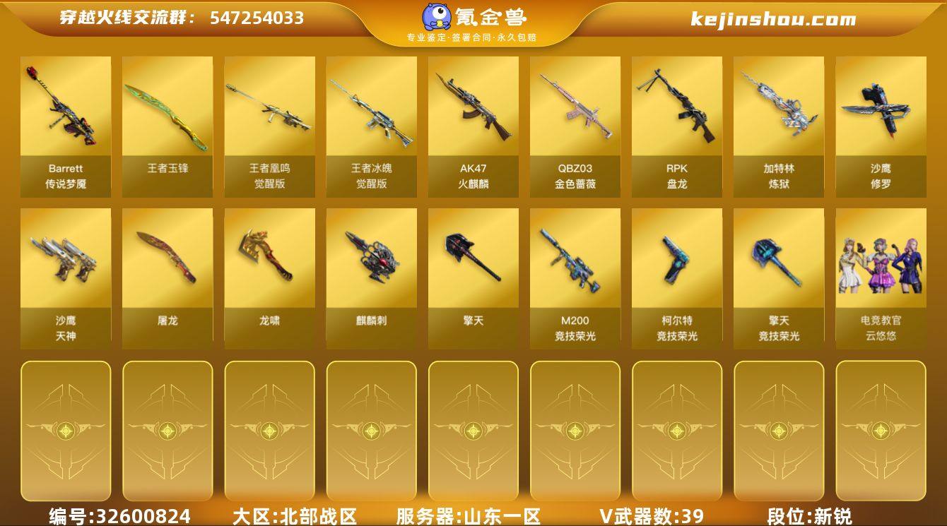 山东一区-43V-4王者武器数-0炫金武器数 【传说武器】:传说梦魇 【热门武器】:传说梦魇,QBZ03-金色蔷薇,M200-竞技荣光,RPK-盘龙*6,加特林-炼狱,USP-雷暴,沙鹰-修罗*4 【王者炫金武器】:王者玉锋 【角色】:电竞教官-云悠悠,初恋灵狐 【挑战大师】:冰龙粉碎者-白马银枪 【英雄级武器】:AK47-火麒麟,QBZ03-金色蔷薇,王者冰魄-觉醒版*2,M200-竞技荣光,王者凰鸣-觉醒版,RPK-盘龙*6,加特林-炼狱,沙鹰-修罗*4,沙鹰-天神,USP-雷暴,柯尔特-竞技荣光,屠龙*2,龙啸,擎天*2,麒麟刺,擎天-竞技荣光,高爆手雷-竞技荣光*3,闪光弹-竞技荣光*5,烟雾弹-竞技荣光*5 【道具】:云海游龙炫彩背包,炫彩背包,绿色巨人,灵魂忍者,迷雾幽灵,夺命之镰,防化服*3,流光-再燃火线,枪王排位29赛季金色流光,语音特效-机器人,EP战队名片,C4-沙漠,防弹头盔*4,防弹衣*4,C4工具钳*3,手雷包*3 【特殊枪械】:6盘龙,1炼狱