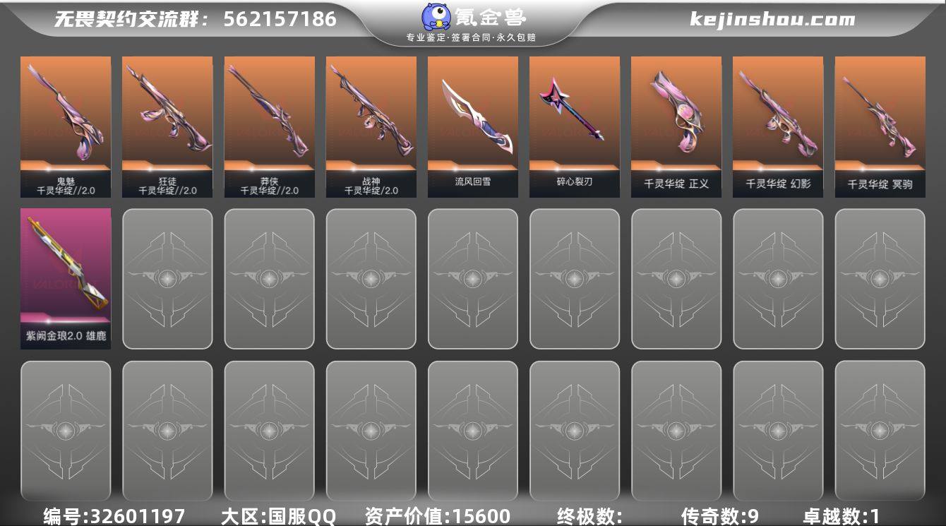 段位: 未定级 套装: 千灵华绽//2.0 套装 近战武器皮肤: 碎心裂刃,流风回雪-千灵华绽//2.0 步枪皮肤: 幻影-千灵华绽,狂徒-千灵华绽//2.0 佩枪皮肤: 正义-千灵华绽,鬼魅-千灵华绽//2.0 狙击枪皮肤: 冥驹-千灵华绽,莽侠-千灵华绽//2.0 霰弹枪皮肤: 雄鹿-紫阙金琅2.0 机枪皮肤: 战神-千灵华绽//2.0 亮点: 【优质装备】:幻影-千灵华绽,冥驹-千灵华绽,正义-千灵华绽,雄鹿-紫阙金琅2.0