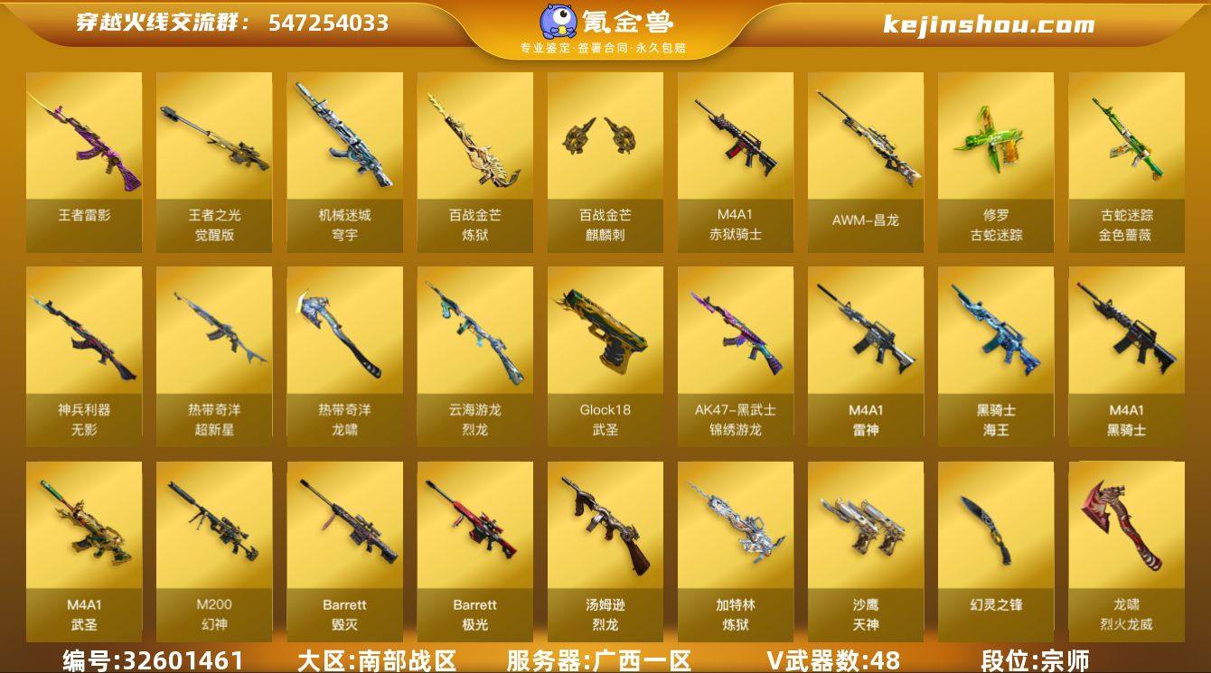 【ky6408】广西一区-47V-6王者武器数-0炫金武器数 【热门武器】:M200-幻神,金色蔷薇-古蛇迷踪,修罗-古蛇迷踪,QBZ03-街机,金色小号,M4A1-黑骑士,汤姆逊-烈龙,加特林-炼狱,雷神-小红,COP-白鲨 【王者炫金武器】:王者雷影 【音效卡】:M200-幻神音效卡,M4A1-雷神音效卡,Barrett-毁灭音效卡,Barrett-极光音效卡,炼狱-百战金芒-庆典舞曲音效卡 【皮肤】:幻神-周瑜皮肤,幻神-动感闪耀 皮肤,幻神-电竞之星 皮肤,雷神-星空,雷神-虎将,雷神-动感闪耀 皮肤,M4A1-再燃火线,火麒麟-华夏之心,火麒麟-斗烈龙驹 皮肤,毁灭-星空,毁灭-黑大圣皮肤,毁灭-英雄计划 皮肤,M4A1-黑龙-361,AK47-黑武士-361,修罗-能量核心,轻型军用手斧-再燃火线 【角色】:华,零·纪元,战地猎狐,王者炫,蛇隐宗,奇洋探员,乔伊教练,云海玲珑,葵-阿尔法武装,幻面灵狐,暗夜-X,飞虎队-X,娟娟,兰-新年限定,灵狐者-X,麻雀,萌儿,潘多拉-甜心教官,蛇姬,斯沃特-X,甜心偶像,铁骑荣耀,兔囡囡,夜玫瑰-宠粉,游珑儿 【人偶武器】:雷神-小红,COP-白鲨,AWM-灵狐-15周年嘉年华,迷你深渊冰龙,迷你裂空之翼,迷你牛魔王,迷你波特博士,迷你曼提柯尔,迷你牛牛,迷你火种,生...