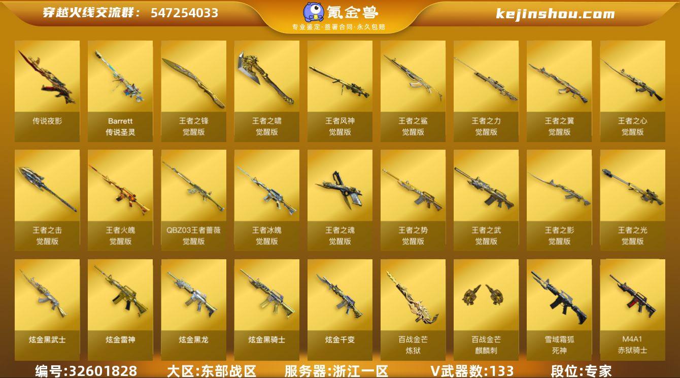 浙江一区-139V-31王者-5炫金 【传说武器】:传说夜影,传说圣灵 【传说角色】:传说艾莉莎 【热门武器】:传说圣灵,传说夜影,QBZ03-金色蔷薇,Scar Light-白虎,M4A1-青龙,M200-幻神*2,金色蔷薇-古蛇迷踪,修罗-古蛇迷踪,M200-竞技荣光,荣耀世冠-火麒麟,荣耀世冠-雷神,白虎-电玩蓝兔,荣耀世冠-柯尔特,Kar98K-星神,炼狱-迷你小钢,M4A1-黑骑士*2,RPK-盘龙*5,加特林-炼狱*2,雷神-小红,COP 357-幻灵*2,沙鹰-修罗,炽芒蝶刃,炽芒蝶刃-破浪逐光 皮肤,荣耀世冠-龙啸,金刚伞 【王者炫金武器】:炫金骑士,炫金黑龙,炫金千变,炫金雷神,炫金武士,王者之魄高爆手雷,王者之魄闪光弹,王者之魄烟雾弹 【音效卡】:M200-幻神音效卡,AK47-火麒麟音效卡,M4A1-雷神音效卡,M4A1-黑龙音效卡,M4A1-黑骑士音效卡*2,Barrett-毁灭音效卡,Barrett-极光音效卡,Scar Light-白虎音效卡,70KG语音包,绝迹语音包,Kar98K-星神音效卡,炼狱-百战金芒-庆典舞曲音效卡,死神-雪域霜狐-怀旧音效卡 【皮肤】:幻神-冠军之幻,M200-幻神-荣耀世冠白鲨,幻神-电流骇客 皮肤,幻神-荣耀世冠白鲨2023 皮肤,白虎-大汉风骨,QBZ03-荣耀世冠白鲨,裁决-羽掣 皮肤,星神-漫游,雷神-暗...