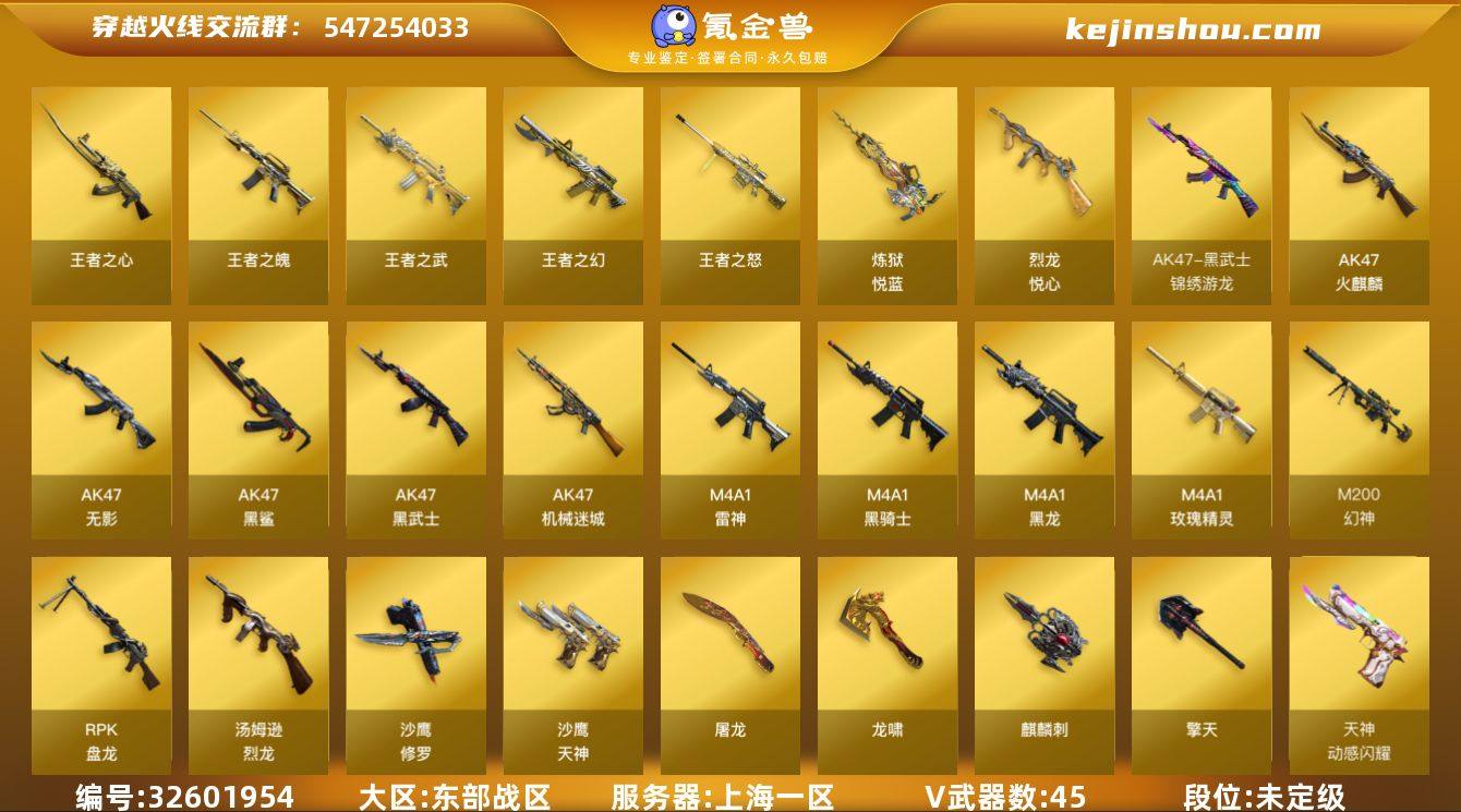 上海一区-47V-8王者武器数-0炫金武器数 【热门武器】:M200-幻神,死亡之眼,C.A.T,M4A1-黑骑士,汤姆逊-烈龙*6,RPK-盘龙*6,加特林-炼狱,沙鹰-修罗*8 【王者炫金武器】:王者之幻,王者之武,王者之魄,王者之心,王者青龙,王者之怒,炼狱-悦蓝,烈龙-悦心 【皮肤】:雷神-暗月,雷神-能量核心,火麒麟-冠军之心,毁灭-暗月,黑龙-能量核心,黑龙-暗月,黑骑士-暗月*3,无影-能量核心,死神-秘银,修罗-能量核心*8,天神-暗月*2 【角色】:葵,樱,王者之瞳,乔伊教练,风暴女,灵狐者-X,潘多拉-X,铁骑荣耀,维纳斯,雪莉杨,影武者-X 【人偶武器】:C.A.T,M4A1-刀锋,迷你牛魔王,迷你牛牛,迷你生化手雷 【暴走生化】:死亡之眼 【英雄级武器】:AK47-火麒麟,M4A1-黑龙,M4A1-雷神*2,M4A1-黑骑士,AK47-无影,AK47-黑武士,AK47-机械迷城,AK47-黑鲨,黑武士-锦绣游龙,M4A1-玫瑰精灵,M200-幻神,Barrett-金色蔷薇,RPK-盘龙*6,加特林-炼狱,汤姆逊-烈龙*6,沙鹰-修罗*8,沙鹰-天神,天神-动感闪耀,屠龙*4,龙啸,擎天,麒麟刺,手雷-动感闪耀 【道具】:战舰背包,炫彩背包,超级背包,哔哩哔哩名片,变异宝贝,生化弹匣,夺命之镰,防化服,金色流光-枪王排...