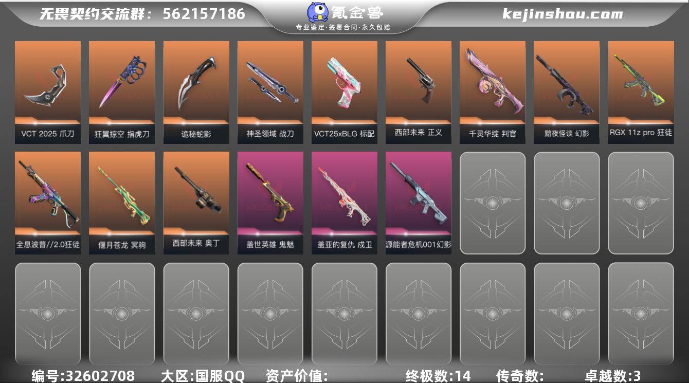 【套装】:VCT 2025 赛季套装 【英雄】:幻棱,炼狱,维斯,暮蝶,钛狐,壹决,铁臂,捷风,雷兹,幽影,不死鸟,贤者,猎枭,蝰蛇,零,芮娜,奇乐,尚勃勒,斯凯,夜露,K/O,海神,盖可,钢锁 【近战武器】:近战武器-VCT 2025 爪刀,近战武器-黑波之刃,近战武器-狂翼掠空 指虎刀,近战武器-全息匕首,近战武器-诡秘蛇影 军刀,近战武器-神圣领域 战刀 【狂徒】:狂徒-全息波普//2.0,狂徒-RGX 11z Pro,狂徒-魄月玄兔,狂徒-诡秘蛇影 【幻影】:幻影-黯夜怪谈,幻影-源能者危机001,幻影-神圣领域,幻影-末日之翼 【戍卫】:戍卫-盖亚的复仇,戍卫-月球哨兵,戍卫-折光棱晶 【獠犬】:獠犬-神圣领域,獠犬-逆冲蛮牛 【冥驹】:冥驹-偃月苍龙,冥驹-星云暗涌 【飞将】:飞将-末日之翼 【莽侠】:莽侠-诡秘蛇影,莽侠-月球哨兵 【战神】:战神-神圣领域,战神-星航勇进 【奥丁】:奥丁-西部未来,奥丁-末日之翼 【判官】:判官-千灵华绽,判官-诡秘蛇影,判官-纳米打击x,判官-炫彩澎湃 【雄鹿】:雄鹿-逆冲蛮牛,雄鹿-月球哨兵 【骇灵】:骇灵-星云暗涌 【蜂刺】:蜂刺-炫彩澎湃,蜂刺-星云暗涌,蜂刺-折光棱晶 【标配】:标配-荒土机兵,标配-折光棱晶 【VCT手枪】:标配...
