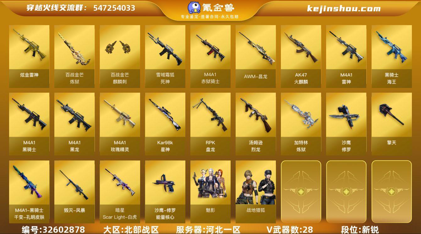 【ky5380】河北一区-30V-0王者武器数-1炫金武器数 【热门武器】:Kar98K-星神,M4A1-黑骑士*2,汤姆逊-烈龙,RPK-盘龙*5,加特林-炼狱,沙鹰-修罗*6 【王者炫金武器】:炫金雷神 【音效卡】:M4A1-雷神音效卡,沙鹰-修罗-盛典舞曲音效卡*2,白虎-盛典舞曲音效卡,炼狱-百战金芒-庆典舞曲音效卡,死神-雪域霜狐-怀旧音效卡,AWM-昌龙-怀旧音效卡 【皮肤】:Scar Light-白虎-暗星,M4A1-再燃火线,毁灭-风暴,M4A1-千变-孔明皮肤,修罗-能量核心,修罗-百战金芒 皮肤,轻型军用手斧-再燃火线 【角色】:魅影,战地猎狐,雪域霜狐,奇洋探员,修道士,葵-赛博朋克,潘多拉-X,潘多拉-甜心教官,影武者-X,智影 【人偶武器】:AWM-灵狐-15周年嘉年华,生化手雷-机甲核心 【挑战大师】:冰龙粉碎者-白马银枪 【英雄级武器】:AK47-火麒麟,M4A1-黑龙,M4A1-雷神,M4A1-黑骑士*2,死神-雪域霜狐,M4A1-玫瑰精灵,黑骑士-海王,Kar98K-星神,RPK-盘龙*5,加特林-炼狱,炼狱-百战金芒,汤姆逊-烈龙,沙鹰-修罗*6,擎天,麒麟刺-百战金芒,M4A1-赤狱骑士,AWM-昌龙 【道具】:BS战队炫彩背包,云山科技背包,亚洲杯纪念炫彩背包,奇洋探员-海龟背包,战舰背包,炫彩背包,百战金芒炫彩...