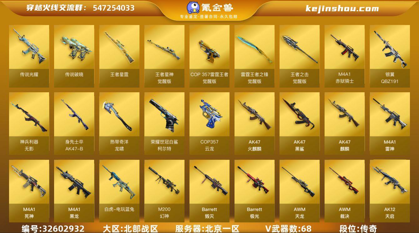 北京一区-74V-16王者武器数-0炫金武器数 【传说武器】:传说光耀,传说破晓 【热门武器】:传说光耀,传说破晓,QBZ03-金色蔷薇,Scar Light-白虎,M200-幻神*2,柯尔特-荣耀世冠白鲨2023,死亡之眼,白虎-电玩蓝兔,荣耀世冠-柯尔特,汤姆逊-烈龙*6,RPK-盘龙*2,毁灭-孙三炮,火麒麟-绝迹,COP-白鲨,USP-雷暴,沙鹰-修罗*2,炽芒蝶刃,金刚伞 【王者炫金武器】:王者星霆,高爆手雷-雷霆王者*6,烟雾弹-雷霆王者,闪光弹-雷霆王者 【音效卡】:Barrett-毁灭音效卡,QBZ03-金色蔷薇音效卡 【皮肤】:幻神-宠儿-2021MVP,幻神-CFS2022,幻神-星耀 皮肤,幻神-星火小队签名臻藏版 皮肤,白虎-巅峰荣耀 皮肤,白虎-白鲨-CFPLS23冠军,QBZ03-荣耀世冠白鲨,裁决-流光秘银,裁决-羽掣 皮肤,裁决-叶芒苍灵 皮肤,雷神-暗月*2,雷神-荣耀之魄,M4A1-战神赵云,雷神-宇航兔皮肤,雷神-CFS十周年纪念版 皮肤,火麒麟-华夏之心,火麒麟-轻羽皮肤,火麒麟-平天大圣,火麒麟-心动糖果,毁灭-暗月,毁灭-AG-CFPLS15冠军,毁灭-虹光风暴 皮肤,毁灭-巅峰荣耀 皮肤*2,黑龙-能量核心,黑骑士-AG-S4冠军典藏,战神-紫绶金章皮肤,AK47-B-常胜将军-曹操*2,AK47-B-常胜将军-刘备,屠龙-荣耀...