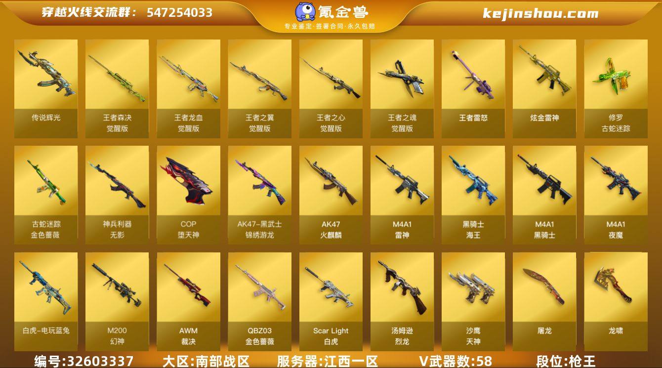 【ky6431】江西一区-69V-16王者武器数-1炫金武器数 【传说武器】:传说辉光 【热门武器】:传说辉光,QBZ03-金色蔷薇,Scar Light-白虎,M200-幻神,金色蔷薇-古蛇迷踪,修罗-古蛇迷踪,M200-竞技荣光,白虎-电玩蓝兔,柯尔特-冠军之特,Cat-刀锋,M4A1-黑骑士,汤姆逊-烈龙,金色蔷薇-空,COP-堕天神,Knife-冠军之刃 【王者炫金武器】:王者雷怒,高爆手雷-雷霆王者*4,烟雾弹-雷霆王者,炫金雷神 【音效卡】:M4A1-黑骑士音效卡,Barrett-极光音效卡,Scar Light-白虎音效卡 【皮肤】:M200-幻神-黄忠皮肤,幻神-宠儿-2021MVP,白虎-电玩粉兔皮肤,白虎-白鲨-CFPLS23冠军,QBZ03-AG-CFPLS19冠军,QBZ03-巅峰荣耀皮肤,裁决-巅峰荣耀 皮肤,雷神-荣耀之魄,雷神-宠儿-2019MVP,雷神-烈虎皮肤,雷神-脉冲核心,雷神-源计划2.0专属 皮肤,火麒麟-冠军之心,火麒麟-平天大圣,火麒麟-白虎,火麒麟-心动糖果,毁灭-冠军之怒,M4A1-千变-孔明皮肤,黑骑士-冠军之势,黑骑士-破界 皮肤,战神-粉色甜心皮肤,战神-紫绶金章皮肤,战神-流金岁月皮肤,AK47-B-常胜将军-曹操,屠龙-荣耀之锋,龙啸-蛇姬 皮肤,擎天-冠军之击 【角色】:葵,凌霄,晴雅,王者玲珑,王者玲珑-小乔,蛇隐...