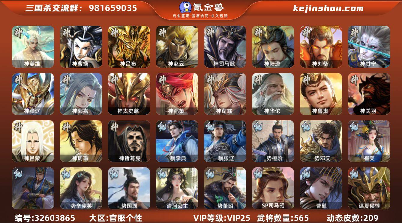 VIP等级: VIP25 官阶: 大将军 武将数量: 565 动态皮肤数量: 209 神将: 神曹操,神甘宁,神郭嘉,神刘备,神陆逊,神吕布,神司马懿,神孙策,神太史慈,神荀彧,神张辽,神赵云,神关羽,神吕蒙,神周瑜,神诸葛亮,神姜维,神鲁肃,神华佗 魏国武将: 刘晔,戏志才,曹纯,曹婴,陈琳,程昱,郝昭,嵇康,界曹真,界于禁,界钟会,马钧,司马师,魏-司马昭,王朗,王凌,王元姬,文鸯,羊徽瑜,杨修,王粲,唐咨-魏,徐庶,张辽,SP蔡文姬,SP曹仁,SP关羽,SP贾诩,SP姜维,SP庞德,卞夫人,蔡贞姬,曹昂,曹操,曹冲,曹洪,曹丕,曹仁,曹叡,曹嵩,贾逵,王异,张恭,鲁芝,界满宠,曹休,界曹植,满宠,荀攸,王基,钟繇,蒯越蒯良,郭嘉,牵招,荀彧,阮慧,杜畿,界郭嘉,崔琰,界曹丕,蒋济,界荀彧,朱灵,界甄姬,辛毗,吕虔,界陈群,界王异,界许褚,界郭淮,华歆,陈群,界邓艾,界典韦,界曹休,谋甄姬,司马孚,袁涣,李通,乐进,辛宪英,郭淮,毛玠,界曹彰,郭皇后,毌丘俭,夏侯惇,曹植,司马朗,谋于禁,界曹操,星周不疑,许褚,界张辽,谋徐晃,蒋干,张郃,钟会,文聘,曹彰,界夏侯惇,诸葛诞,司马懿,甄姬,杨阜,界徐晃,徐晃,界曹仁,孙资刘放,韩浩史涣,胡班,曹真,谋曹丕,典韦,界夏侯渊,谋荀彧,夏侯渊,李典,于禁,王双,邓艾,界司马懿,张春华,孟达-魏,臧霸,牛金,朱灵(国战),文钦-魏...