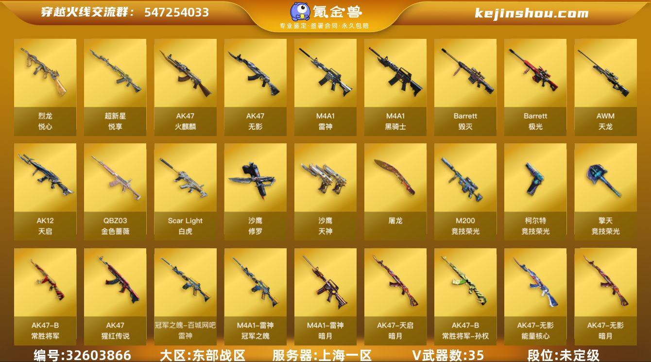 上海一区-42V-2王者武器数-0炫金武器数 【热门武器】:QBZ03-金色蔷薇,Scar Light-白虎,M200-竞技荣光,柯尔特-冠军之特,M4A1-黑骑士,沙鹰-修罗*4 【王者炫金武器】:超新星-悦享,烈龙-悦心 【音效卡】:M4A1-雷神音效卡,绝迹语音包,死神-雪域霜狐-怀旧音效卡 【皮肤】:Scar Light-白虎-暗星,QBZ03-冠军之薇,雷神-暗月,雷神-冠军之魄,火麒麟-百城,火麒麟-心动糖果,毁灭-暗月*2,毁灭-英雄计划 皮肤,无影-暗月,无影-能量核心*2,天启-暗月,AK47-B-常胜将军-孙权*2,极光-能量核心 【角色】:葵,电竞教官-云悠悠,战地猎狐,雪域霜狐,初恋灵狐,灵狐者-X,灵狐者-七夕宝贝,潘多拉-甜心教官,斯沃特-X,铁骑荣耀,影武者-X,职业选手 【人偶武器】:迷你超能女侍 【暴走生化】:超级对讲机 【挑战大师】:冰龙粉碎者-白马银枪,神圣爆裂者-末日III 【英雄级武器】:AK47-火麒麟*2,M4A1-雷神*2,M4A1-黑骑士,AK47-无影,AK12-天启,Scar Light-白虎,死神-雪域霜狐,QBZ03-金色蔷薇,AK-47-猩红传说,AK47-B-常胜将军*2,AWM-天龙,Barrett-毁灭*2,Barrett-极光,M200-竞技荣光,沙鹰-修罗*4,沙鹰-天神,柯尔特-冠军之特,柯尔特-竞技荣光,屠龙,擎天-竞...