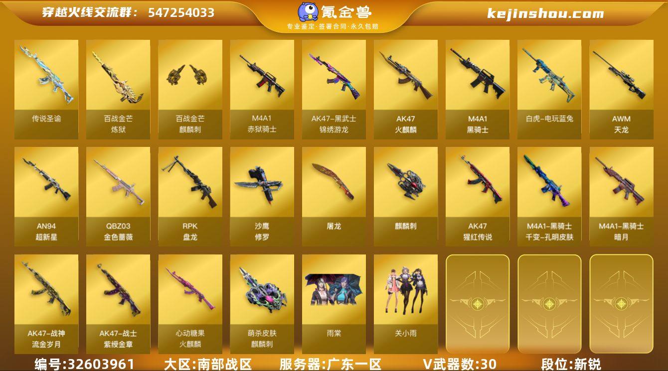 【ky5348】广东一区-34V-3王者武器数-0炫金武器数 【传说武器】:传说圣谕 【传说角色】:传说星骇 【热门武器】:传说圣谕,QBZ03-金色蔷薇,死亡之眼*2,白虎-电玩蓝兔,M4A1-黑骑士*2,RPK-盘龙*6,沙鹰-修罗 【王者炫金武器】:王者冰锋 【音效卡】:炼狱-百战金芒-庆典舞曲音效卡 【皮肤】:星神-璀璨皮肤,M4A1-再燃火线,火麒麟-心动糖果,M4A1-千变-孔明皮肤,黑骑士-暗月,战神-紫绶金章皮肤,战神-流金岁月皮肤,轻型军用手斧-再燃火线,麒麟刺-萌杀皮肤 【角色】:雨棠,关小雨,风暴女,嘉年华灵狐,灵狐者-X,灵狐者-黄金海岸,龙儿-小淘气,麻雀,曼陀罗-X,萌儿,斯沃特-X,铁骑荣耀,兔囡囡,雪莉杨-摸金校尉 【人偶武器】:AWM-灵狐-15周年嘉年华,黄金迷你深渊冰龙,迷你深渊冰龙*2,迷你裂空之翼*3,黄金迷你裂空之翼,迷你波特博士*5,迷你牛牛*5,迷你火种*5,迷你生化手雷*2,深渊终结者手雷,迷你艾比,迷你超能女侍,迷你巨石泰坦-魔花研究所 【暴走生化】:双面神,死亡之眼*2,超级对讲机 【挑战大师】:暴君乱世-超越Max,神圣爆裂者III*2,冰龙粉碎者-白马银枪*2,激光毁灭者III-白马银枪,VEPR-12-金魔*2,激光毁灭者III*6,机甲撕裂者III*2,试...