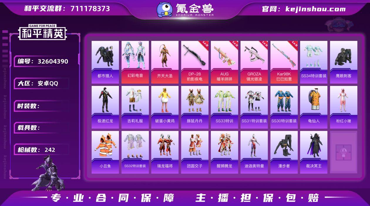 安卓Q 可二次 3粉装7特效枪185套装242枪皮 都市猎人 梦幻火箭 幻彩电音 齐天大圣 AKS-74U-森灵之息(5级) Kar98K-巳巳如意(5级) DP-28-豹影疾电(5级) AUG-暖羊咩咩(5级) GROZA-镜光银凌(5级) Mk14-福马献瑞(5级) AA12-G-萌骑幻想(3级) 齐天大圣飞行器 梦幻火箭头盔 梦幻火箭背包 深海曼妙背包 小丑鱼 龟仙人 鹰眼刺客 裁决冥王 迪迦奥特曼 醒狮腾龙 团圆交子 瑞龙福将 粉红小猪 豚鼠丹丹 漫步者 破蛋小黄鸡 极速红龙 AKM-奇异狩猎者 M762-瑞龙福将 M24-奇异狩猎者 和平精英账号