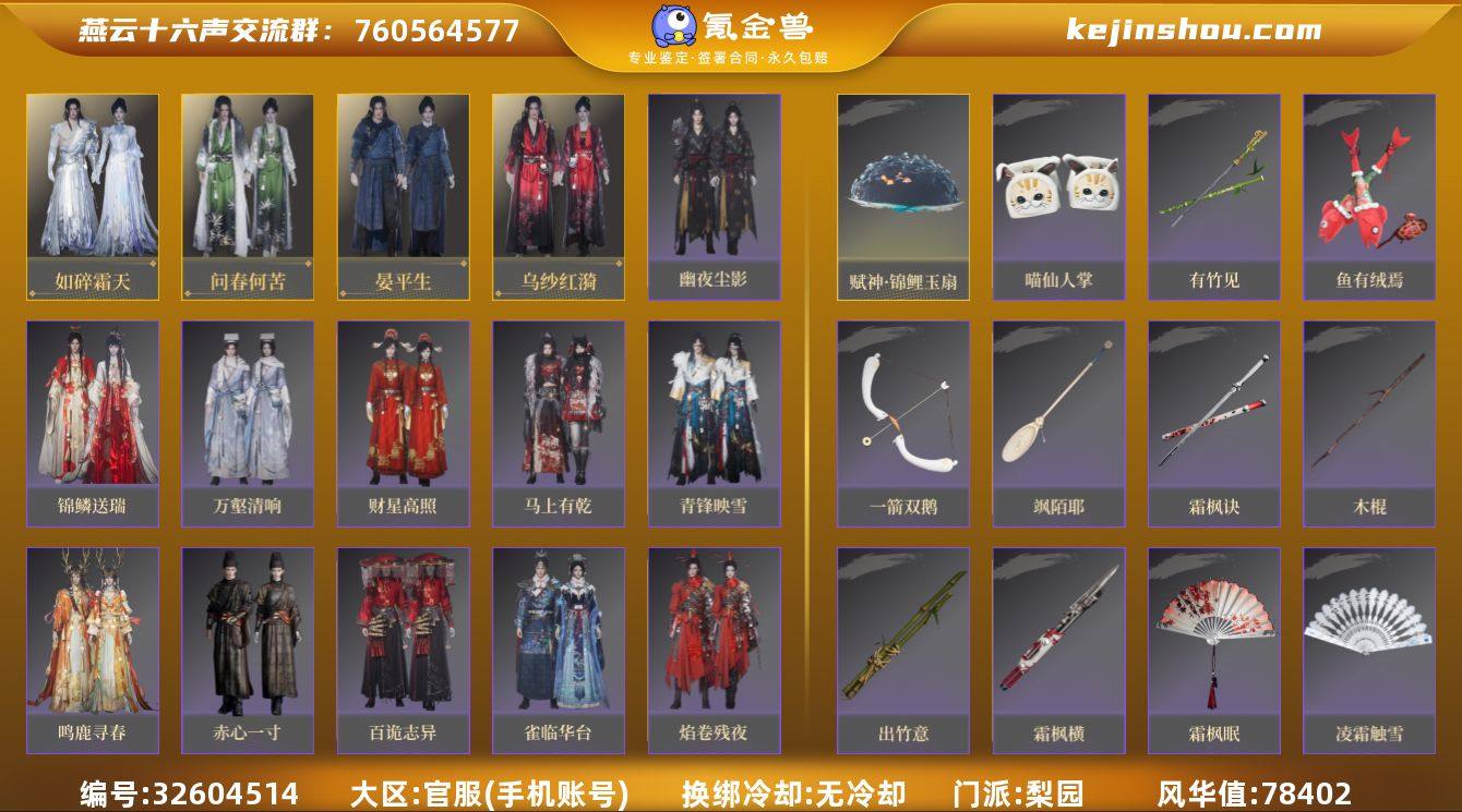 出燕云十六声官服成品号 可议价 风华 78402,战力 4.072e 已用 8(小鹿头发自染白金,碎冰冰,小羊头,祭火;分解音玉换了奇术特效鳞跃天倾;赋神联名锦鲤扇),包里还有 4 八音窍, 2 个未用绑定;2 个未用非绑定, 除了一代战令都有,二代选的云瑶鹤影 限时时装有啸月,七夕,元宵锦鳞送瑞,乌龟对对碰披挂,聆音池小鹿黑发全套 1699.2w宝钱和 1 万玉,剩余 68 天月卡;2529 长鸣珠子 家业十级,300 多w金谷粒 不见山之前的地图满探 欧度可以, 大保底或者单抽双黄概率都高