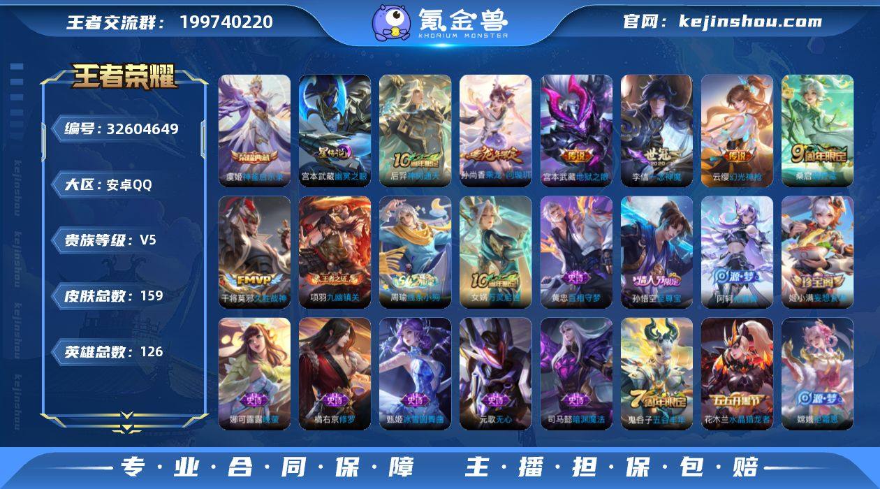 【XY870】贵族5/皮肤159/典藏1/传说7/史诗36/英雄126/孙权全皮/空空儿全皮/神鉴启示录/幽冥之眼/神树通天/幻光神枪/鸣野蒿/乘龙·问璇玑/一念神魔/久胜战神/地狱之眼/天穹之誓(s36)/破阵·退雄兵/阴阳师/皇家上将/无心/沙漠行僧(s26)/海滩派对/金庭之子(s27)/至尊宝/五谷丰年/擒涛扼浪(s31)/拒霜思/探海日志(s32)/海盐诗旅(s30)/女武神/江河有灵/古海寻踪(s33)/高渐离燃音魔法/妲己灵卜魔法/鬼谷子天穹祈灯(S34)/妄想食味/龙武盛年/剑破天穹(s35)/程咬金群星魔术团/熔金海岸/噬灭天穹(s37)/谧流熔炉/虚灵犬护/逆浪荇歌/荣光之誓/九幽镇关/线条小狗-周瑜/万灵启世/百相守梦-黄忠/化蝶舞/暗渊魔法/修罗/晚萤/鹰眼统帅/箭羽风息/猫狗日记-孙策/节奏热浪/星夜王子/黄金分割率/缤纷独角兽/乘风破浪/水晶猎龙者/千年之狐/幽灵船长/圣诞狂欢/金属风暴/魅力维加斯/摇滚巨星/暗夜贵公子/水果甜心/鬼剑武藏/冰雪圆舞曲/圣诞恋歌/未来纪元-赵云/班班快跑/糖果风暴/溯影追猎/极光幻客/逐霄之志/鹤鸣心笺/径山谋武/罗小黑战记/克喵/踏浪烽翎/戏梦巡演/锦麟游梦/死霸装/小满鸭/命运加冕/布丁狗之约/灵野札记/春野闲踪/浪漫序章/玫蓝誓约/景韶洛都/星梦巡礼/雪境奇遇-西施/铁骨偃魂/苍林狼骑/雾...