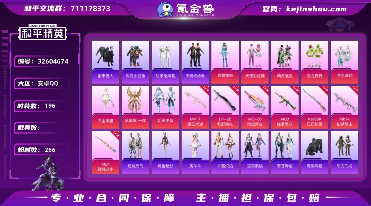 YZJ16093-可二次-安卓Q-5稀有8粉装9特效枪13热门【精品身法号 伤感小雾神套装 千金淑猫 凤凰座一辉 天网 都市 双马尾 红眼罩 天命 NV战队服 小丑鱼 动感兔斯基 东方飞龙 冷酷挑战者 娜可露露 都市丽猫 晶灵使者 多款满级特效枪 1级龙翔九天飞行器 1级信仰神谕飞行器 千金淑猫背包头盔 伙伴-粉雪蛇宝 13款飞行器】196套装266枪皮 80416热力值 12印记 历史传奇王牌17星 【5稀有】 M416-黄金龙骨 AWM-黄金龙骨 都市猎人 浪漫天命 天网终结者 【8粉装】 凤凰座一辉 天使彩虹糖 千金淑猫 金丰海韵 异瞳寒姬 幻彩电音 精灵迷巫 恐龙拽拽 【9特效枪】 AKM-绿萝繁花 (5级) Kar98K-巳巳如意 (5级) MG-36-沧焰双生 (5级) DP-28-豹影疾电 (5级) Mk14-甜梦熊击 (5级) M24-镜域双华 (3级) M417-第五大道 (7级) Mk14-福马献瑞 (1级) ACE32-萌骑漫游 (5级) 【13热门】 小丑鱼 龟仙人 东方飞龙 动感兔斯基 兔兔小魔女 鹰眼刺客 深海小丑鱼 NV战队服 暗影哥特 漫步者 破蛋小黄鸡 极速红龙 军刀雅典娜 【1飞行器】 龙翔九天飞行器 【2头盔】 梦幻火箭头盔 金羽特工头盔 【1背包】 金羽特工背包 营地ID:917990238