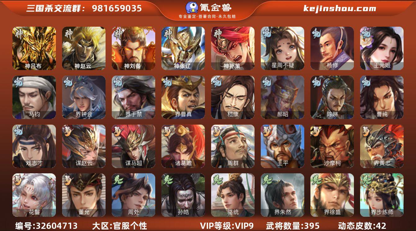 【596】官阶:大将军;VIP等级:VIP9;史诗武将数量:47;动态皮肤数量:42;武将总数:395;史诗宝珠数量:3;将魂数量:10840;神将:8;魏国史诗武将:21;蜀国史诗武将:9;吴国史诗武将:7;群史诗武将:14 神吕布,神赵云,神刘备,神张辽,神孙策,神关羽,神吕蒙,神周瑜,星周不疑,杨修,王元姬,马钧,界钟会,界于禁,界曹真,嵇康,郝昭,陈琳,曹纯,戏志才,谋赵云,谋马超,诸葛瞻,周群,王平,沙摩柯,界黄忠,花鬘,董允,周处,孙皓,骆统,界朱然,界徐盛,界步练师,贺齐,左慈,张让,星甘宁,陶谦,苏飞,麹义,南华老仙,沮授,界李儒,公孙康,杜预,张绣,李傕,许攸,神孙策-霸王再世(动态),神赵云-战龙在野(动态),神赵云-神龙天降,张昌蒲-龙年端午(动态),SP蔡文姬-兔年冬日(动态),荀彧-驱虎吞狼(动态),钟会-谋谟之勋(动态),界钟会-谋谟之勋(动态),辛宪英-鼠年春节(动态),戏志才-举棋若定(动态),曹婴-锋芒毕露(动态),朱灵-以战破氐(动态),曹纯-虎年春节(动态),王元姬-鼠年冬至(动态),卧龙诸葛-龙跃凤鸣(动态),刘备-明良千古(动态),马超-牛年春节(动态),马超-虎年冬至(动态),界刘备-明良千古(动态),界马超-牛年春节(动态),周处-义除三害(动态),周瑜-兔年七夕(动态),孙尚香-星流霆击(动态),大乔-绝世之姿(动态),...
