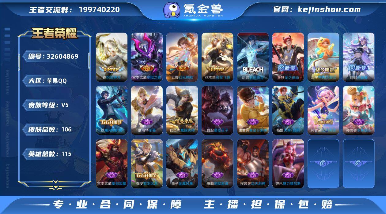 V5 6传说 115英雄 106皮肤 可修改实名 男号 【英雄全皮】大禹全皮 【稀有英雄】大司命,韩信(韩跳跳),夏洛特(夏师傅),艾琳,橘右京(橘子),娜可露露(鸟人),不知火舞,赵云,戈娅 【传说皮】幻光神枪,地狱之眼,末日机甲-孙尚香(绿蚂蚱),冠军飞将,炽阳神光 【珍宝阁皮】妄想食味,玩趣恶龙 【赛季/战令皮】古海寻踪(s33),海盐诗旅(s30),探海日志(s32),天穹祈灯(s34),天穹之誓(s36),驱傩正仪(s24),千军破阵(s25),胡桃异想国,沙漠行僧(s26),大漠名商(s28),云中旅人(s29) 【史诗皮】化蝶舞,线条小狗-周瑜,九幽镇关,鸭鸭历险记-刘禅,光弋星穹,涂山容容,龙之律动,石田雨龙,百相守梦-黄忠,黄金分割率,永昼,江河有灵,末日机甲-吕布,水果甜心,星夜王子,功夫厨神,鬼剑武藏,天秀·启明,地狱岩魂,曙光守护者,箭羽风息,金属风暴,鹰眼统帅,魅力维加斯 【限定皮】愿照·岁时盈(虞姬年限),李小龙 【普通皮】谧流熔炉,雪境奇遇-西施,街头霸王,龙舞盛年,玫蓝誓约,虚灵犬护,荣光之誓,往忆晖光,鹤鸣心笺,溯影追猎,罗小黑战记-哪吒,克喵,鸭鸭历险记-沈梦溪,春野闲踪,命运加冕,布丁狗之约,小满鸭,踏浪烽翎,死霸装,锦麟游梦,逆浪荇歌,潮玩造梦师,太极少年,零食大作战,热血海滩,鬼谷子天穹祈灯(S34),威尼斯狂欢...