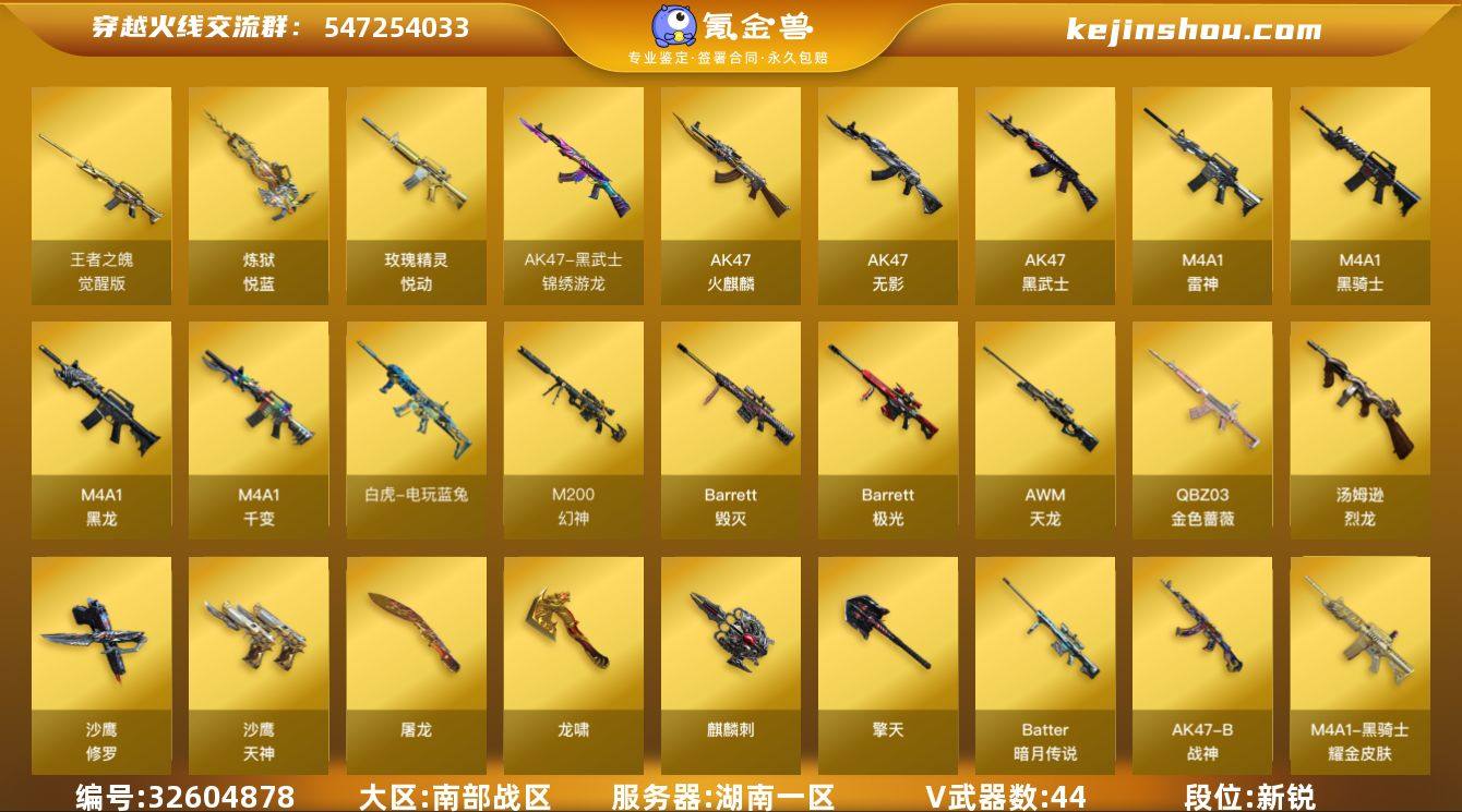 湖南一区-45V-3王者武器数-0炫金武器数 【热门武器】:QBZ03-金色蔷薇,M200-幻神,白虎-电玩蓝兔,M4A1-黑骑士,汤姆逊-烈龙*7,沙鹰-修罗*3 【王者炫金武器】:玫瑰精灵-悦动,炼狱-悦蓝 【音效卡】:AK47-火麒麟音效卡,M4A1-黑骑士音效卡,Barrett-毁灭音效卡 【皮肤】:幻神-丹凤,雷神-暗月,雷神-星空,雷神-冠军之魄,雷神-宇航兔皮肤,火麒麟-雷神,火麒麟-战神关羽,火麒麟-平天大圣,火麒麟-盘古,毁灭耀金皮肤,毁灭-星空,黑龙-能量核心*2,黑骑士耀金皮肤,无影-暗月*2,无影-能量核心,无影耀金皮肤,天启-暗月*2,战神-粉色甜心皮肤,AK47-B-常胜将军-孙权,天龙-秘银,天龙-能量核心,天神-暗月 【角色】:零,王者樱-热浪之夏,王者之瞳,奇洋探员,乔伊教练,修道士,空,暗夜-X,初恋灵狐,电竞少女,嘉年华灵狐,零-水下丽影,灵狐者-七夕宝贝,曼陀罗-X,潘多拉-X,潘多拉-甜心教官,铁骑荣耀,新娜塔莎,樱-战斗天使 【人偶武器】:AWM-灵狐-15周年嘉年华,迷你超能女侍 【英雄级武器】:M4A1-千变,AK47-火麒麟,M4A1-黑龙*2,M4A1-雷神,M4A1-黑骑士,AK47-无影,AK47-黑武士,黑武士-锦绣游龙,QBZ03-金色蔷薇,王者之魄-觉醒版,AK47-B-战神,白虎...