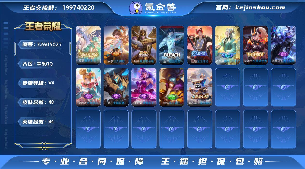 【精品小号·馥梦繁花·无相·愿照九州拓·可二次】w14873-苹果Q-84英雄-48皮肤-1王者印记-60铭文-贵族积分1w【贵族6】【1珍品无双·1无双·3传说】【因赛季更新游戏段付以上号为准!】 【珍品无双】:貂蝉馥梦繁花 【无双皮肤】:孙悟空无相 【传说皮肤】:澜愿照九州拓,云缨幻光神枪,后羿黄金射手座 【限定皮肤】:赵云皇家上将,元歌无心,狄仁杰魔术师,项羽海滩派对 【年限皮肤】:澜愿照九州拓 【赛季限定】:东皇太一噬灭天穹,太乙真人谧流熔炉,钟馗虚灵犬护,甄姬逆浪荇歌,亚瑟荣光之誓 【战令限定】:周瑜线条小狗 【史诗皮肤】:赵云皇家上将,王昭君偶像歌手,狄仁杰魔术师,孙尚香水果甜心,墨子金属风暴,花木兰水晶猎龙者,百里守约特工魅影,元歌无心,赵怀真器灵浮梦炉,狂铁龙之律动,后羿石田雨龙,周瑜线条小狗 【其他皮肤】:项羽海滩派对,韩信街头霸王,芈月红桃皇后,妲己少女阿狸,达摩拳王,刘备万事如意,孙尚香沉稳之力,蒙犽胡桃狂想曲,海月幻泉雾影,后羿完美运算,东皇太一噬灭天穹,苍苍林狼骑,太乙真人谧流熔炉,西施雪境奇遇,东皇太一金福满堂,钟馗虚灵犬护,露娜命运加冕,雅典娜潮玩士官长,白起死霸装,甄姬逆浪荇歌,亚瑟荣光之誓,虞...