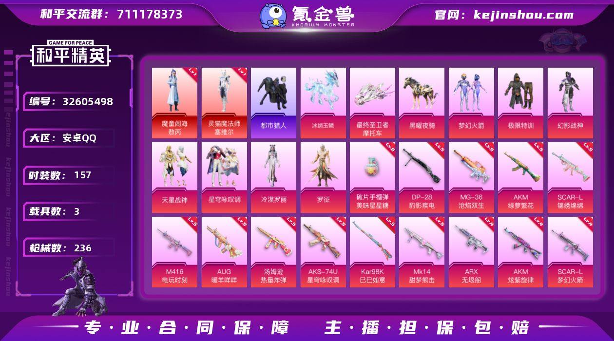 安卓 手Q-2神装-7粉装-19特效枪-3载具-7粉色飞行器-78185热力值-10王牌印记-157套装-236枪皮 【红色神装等级】:魔童闹海-敖丙(一级),灵猫魔法师-塞维尔(一级) 【红色角色神装】:魔童闹海-敖丙,灵猫魔法师-塞维尔 【热门品类】:粉装-梦幻火箭,套装-浪漫天命,套装-都市猎人,角色-军刀雅典娜,套装-暗影哥特,套装-红熊茄茄 【粉色套装】:粉装-极限特训,粉装-幻影战神,粉装-梦幻火箭,粉装-天星战神,粉装-星穹咏叹调,角色-冷漠罗丽,角色-罗征 【粉色枪皮等级】:AKM-炫紫旋律(四级),AKM-绿萝繁花(五级),SCAR-L-梦幻火箭(四级),SCAR-L-锦绣绵绵(五级),M416-电玩时刻(五级),M416-灵猫魔法师(三级),AUG-暖羊咩咩(五级),ACE32-萌骑漫游(三级),ARX-无垠阁(四级),汤姆逊-热量炸弹(五级),AKS-74U-星穹咏叹调(五级),P90-冷漠罗丽(三级),P90-魔童闹海 敖丙(三级),Kar98K-巳巳如意(五级),Mk14-甜梦熊击(五级),DP-28-豹影疾电(五级),MG-36-沧焰双生(五级),燃烧瓶-天降桃花(六级),破片手榴弹-美味星星糖(六级) 【粉色载具】:最终圣卫者摩托车,黑曜夜骑,冰绡玉鳞 【粉色枪皮】:AKM-炫紫旋律,AKM-绿萝繁花,SCAR-L-梦幻火箭,SCAR-L-锦绣绵绵,M416-电玩...