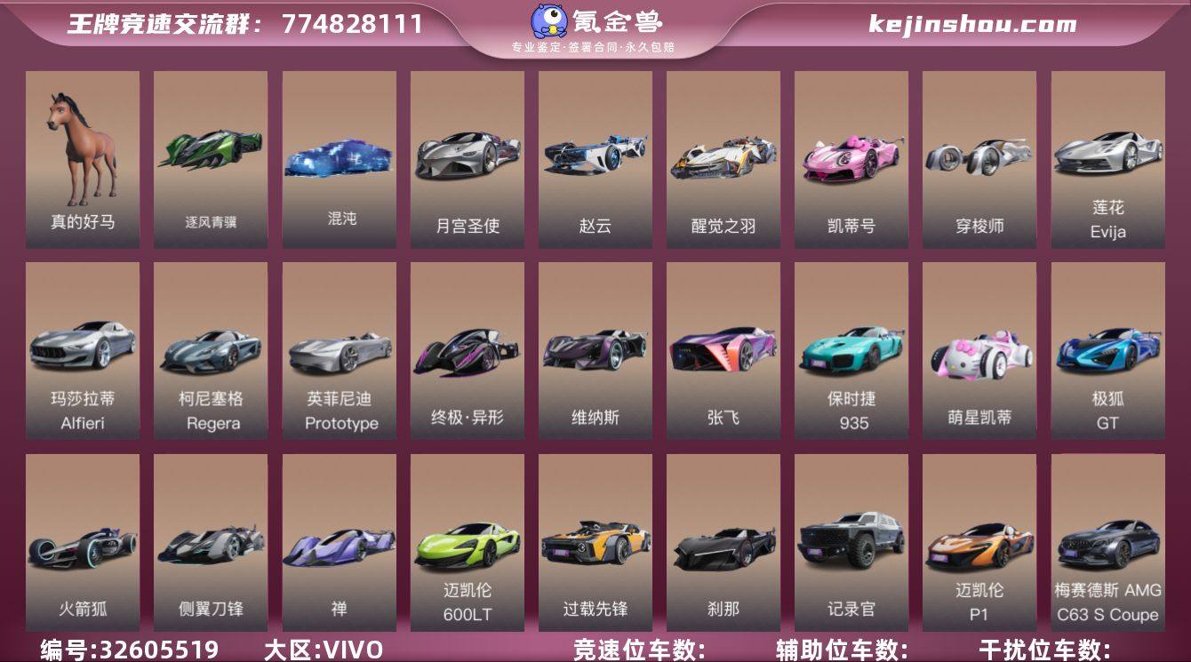 真的好马,逐风青骥,混沌,月宫圣使 赵云,醒觉之羽,凯蒂号,穿梭师,莲花 Evija,玛莎拉蒂 Alfieri,柯尼塞格 Regera,英菲尼迪 Prototype,终极·异形,维纳斯,张飞,保时捷 935,萌星凯蒂,极狐 GT,火箭狐,侧翼刀锋,禅,迈凯伦 600LT,过载先锋,刹那,记录官,迈凯伦 P1,梅赛德斯-AMG C63 S Coupe 竹叶青,星穹幻音,福特-Mustang,泡泡旅行者,雪佛兰 Corvette ZR1,超音速,逐浪,洛基,路虎卫士,饿龙传说,绿箭骑士,道奇 Challenger SRT 392,坦克 300,魔鬼鱼,干扰者,开拓铁铲,泰坦,法拉第,燃烧太阳 筋斗云,宝马-M4-CSL,游龙惊鸿,摇尾萌萌虎,蛋仔出击,幻蝶,月宫舞灵,先驱者,催化剂,玉麒麟,逮虾货运,猫眠梦,星际探路者,奥迪 TT RS,平行巡洋舰,以太,道奇 Charger SRT Hellcat,风神,阿斯顿马丁 Vanquish,比亚迪 汉,大众ID.R 晴空碧海,夏日清凉套装,比翼连理套装 卖家说:vivo渠道服,可完整换绑,安全无找回。V8账号,114辆赛车多台满改,1136万礼品点,309件时装含至臻限定,历史巅峰车神,老号养成度拉满。800一口价,平台担保交易,诚心要直接拍!