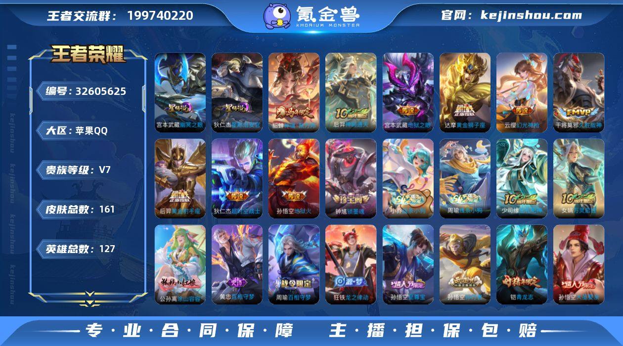 实名: 可修改 贵族等级: V7 英雄数: 127 皮肤数: 161 星传说: 幽冥之眼,星际治安官 传说皮: 黄金狮子座,黄金射手座,久胜战神,地狱火,地狱之眼,超时空战士-狄仁杰,幻光神枪,神树通天,神骥·聚万邦 限定皮: 李小龙,御风骁将,飞衡,青龙志,朱雀志,至尊宝,大圣娶亲,孙行者,傲雪梅枪,五谷丰年