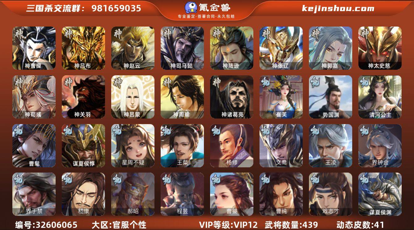 sgss编号5999 热门武将斗地主大将军 新品崔芙 回廊十常侍 势魏延 势国渊 动谋关羽 曹髦 双形态司马昭 回廊张奋 清河公主 回廊文鸯 势陆郁生 回廊神曹操 动神郭嘉 回廊神荀彧 动神司马 杜预 裴秀 神太 61史诗二等大将军 37宝珠 160排位 道具充足 官方个性账号官阶:大将军;VIP等级:VIP12;史诗武将数量:61;动态皮肤数量:41;武将总数:439;史诗宝珠数量:37;将魂数量:10343;神将:10;魏国史诗武将:22;蜀国史诗武将:10;吴国史诗武将:10;群史诗武将:17 神曹操,神吕布,神赵云,神司马懿,神陆逊,神张辽,神郭嘉,神太史慈,神荀彧,神诸葛亮,曹髦,星周不疑,王粲,杨修,王凌,界钟会,界于禁,嵇康,郝昭,曹婴,曹纯,戏志才,谋夏侯惇,清河公主,势国渊,崔芙,程昱,谋赵云,谋马超,赵襄,王平,沙摩柯,谯周,界黄忠,董允,谋关羽,势魏延,张奋,周处,孙皓,骆统,留赞,界徐盛,贺齐,势陆郁生,文鸯,十常侍,裴秀,左慈,星甘宁,苏飞,麹义,沮授,界李儒,公孙康,杜预,卑弥呼,谋张角,许攸,星董卓,兀突骨,司马昭,神吕蒙,神周瑜,神关羽,势夏侯尚,SP关羽,SP曹仁,SP蔡文姬,乐进,曹昂,诸葛诞,朱灵,文聘,SP姜维,张春华,钟会,曹冲,郭淮,满宠,界王异,界曹操,界司马懿,界夏侯惇,界张辽,界许褚,界郭嘉,李典,曹真,韩浩史涣...