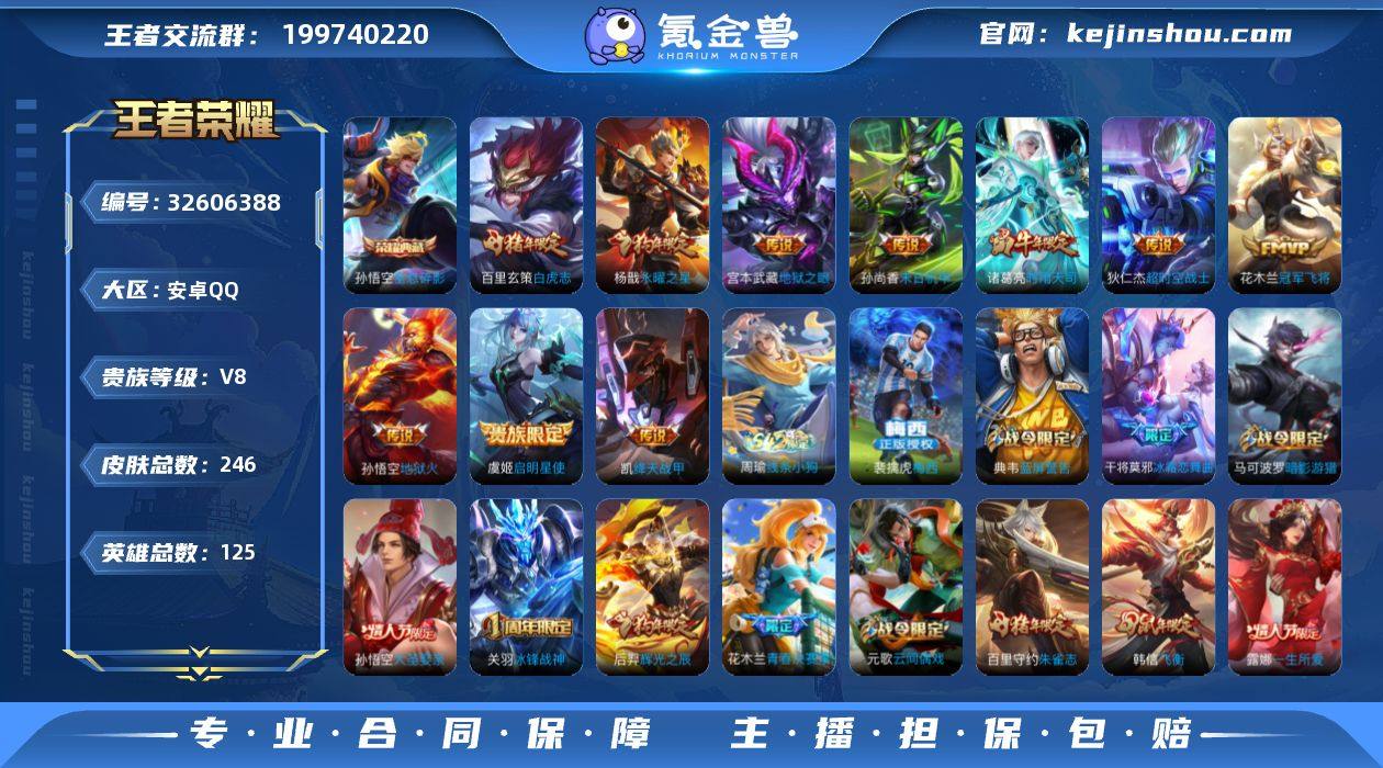 W15407 可立即换绑无需挂单养号 铭文满级 典藏1 传说10 按键1 夺宝176 安卓Q-V8-最强王者段位-125英雄-246皮肤-1典藏皮肤-10传说-65史诗 【荣耀典藏】:孙悟空全息碎影 【传说皮肤】:诸葛亮时雨天司,铠绛天战甲,虞姬启明星使,百里玄策白虎志,花木兰冠军飞将,杨戬永曜之星,孙尚香末日机甲,宫本武藏地狱之眼,孙悟空地狱火,狄仁杰超时空战士 【限定皮肤】:白起狰,狄仁杰阴阳师,虞姬凯尔特女王,赵云皇家上将,墨子神迹守卫,嬴政白昼王子,鲁班七号狮舞东方,庄周高山流水,高渐离死亡摇滚,高渐离玩趣恶龙,阿轲迷踪丽影,钟无艳王者之锤,孙膑妖精王,扁鹊炼金王,芈月重明,芈月幻夜卜梦,吕布猎兽之王,周瑜赤莲之焰,元歌云间偶戏,夏侯惇朔风刀,曹操烛龙,典韦穷奇,典韦蓝屏警告,马可波罗暗影游猎,狄仁杰魔术师,狄仁杰万华元夜,达摩星际陆战队,达摩沙漠行僧,项羽海滩派对,老夫子醍醐杖,老夫子航海奇遇记,关羽冰锋战神,程咬金演武夺筹,露娜一生所爱,刘邦夺宝奇兵,韩信逐梦之影,韩信飞衡,兰陵王驯魔猎人,兰陵王金庭之子,花木兰青春决赛季,花木兰瑞麟志,亚瑟潮玩骑士王,孙悟空美猴王,孙悟空大圣娶亲,牛魔御旌,后羿辉光之辰,...