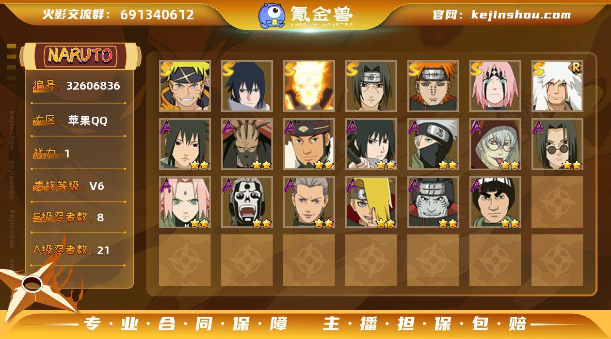 实名: 不可修改 贵族等级: V6 S忍数: 8 A忍数: 21 战力值(万): 1 S级忍者: 佩恩「天道」,宇智波鼬 「须佐能乎」,自来也 「舞之豪杰」,漩涡鸣人 「九喇嘛连结」,春野樱 「忍界大战」,宇智波佐助「永恒万花筒」,漩涡鸣人·宇智波佐助 热门A级忍者: 宇智波佐助「须佐能乎」,宇智波鼬「新春限定」