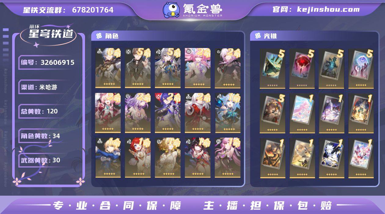 【崩坏·星穹铁道】冒险等级:70,女主,五星数量:64,五星角色:白厄 * 6命,布洛妮娅 * 5命,瓦尔特 * 5命,克拉拉 * 2命,遐蝶 * 2命,黄泉 * 2命,风堇 * 2命,长夜月 * 2命,昔涟 * 2命,希儿 * 1命,白露 * 1命,姬子 * 1命,阿格莱雅 * 1命,缇宝 * 1命,刃 * 1命,符玄 * 1命,花火 * 1命,Saber * 1命,刻律德菈 * 1命,云璃,飞霄,银狼,景元,杰帕德,彦卿,星期日,丹恒·饮月,藿藿,真理医生,知更鸟,赛飞儿,Archer,丹恒·腾荒,波提欧__五星光锥:星海巡航 * 5精,记一位星神的陨落 * 5精,孤独的疗愈 * 5精,记忆永不落幕 * 5精,镜中故我 * 3精,记忆的质料,制胜的瞬间,银河铁道之夜,银河铁道之夜,以世界之名,无可取代的东西,时节不居,时节不居,但战斗还未结束,于夜色中,拂晓之前,不息的演算,回到大地的飞行,将光阴织成黄金,她已闭上双眼,让告别,更美一些,游戏尘寰,行于流逝的岸,愿虹光永驻天空,黎明恰如此燃烧,理想燃烧的地狱,没有回报的加冕,金血铭刻的时代,致长夜的星光,爱如此刻永恒__四星角色:阿兰 * 6命,虎克 * 6命,貊泽 * 6命,黑塔 * 6命,丹恒 * 6命,艾丝妲 * 6命,希露瓦 * 6命,停云 * 6命,素裳 * 6命,桑博 * 6命,三月七 * 6命,青雀 * 6命,佩拉 * 6命,驭空 * 6命,卢卡 * 6命,玲可 * 6命,寒...