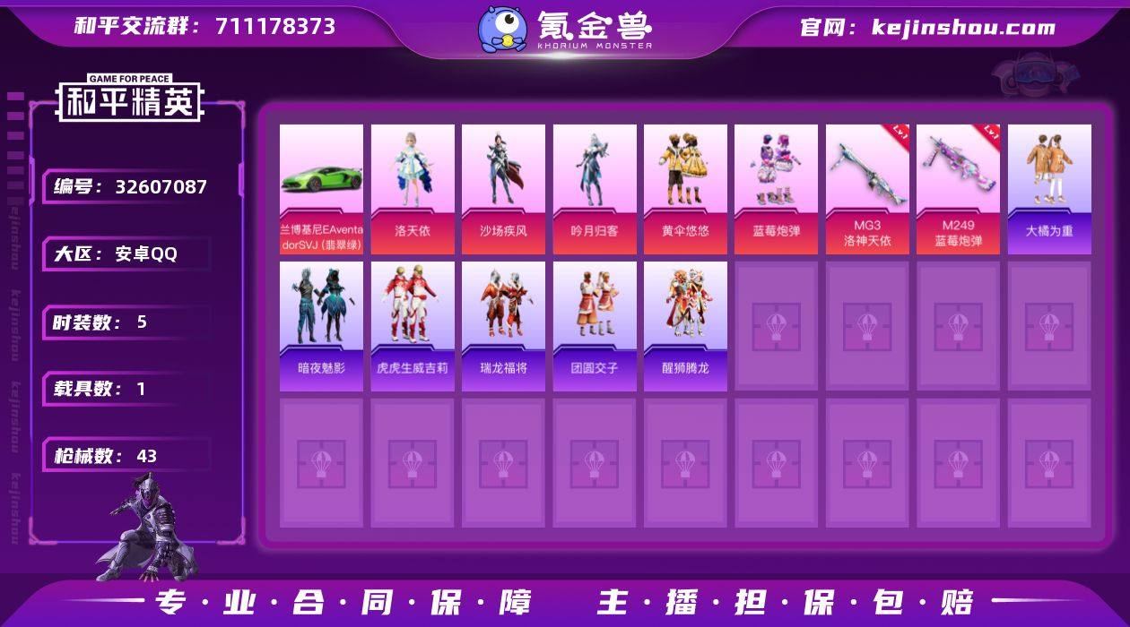 M1047130【女号1载具-5粉装-2特效枪黄伞悠悠,吟月归客,角色-洛天依,沙场疾风,蓝莓炮弹】安卓手Q-1载具-5粉装-2特效枪-37套装-43枪皮-1王牌印记-英勇黄金Ⅲ-20584热力值【1载具】兰博基尼Aventador SVJ(翡翠绿)【5粉装】黄伞悠悠,吟月归客,角色-洛天依,沙场疾风,蓝莓炮弹【2特效枪】MG3-洛神天依[4级],M249-蓝莓炮弹[4级]【1飞行器】火焰蝠人飞行服【1背包】神秘黑猫背包【73其它衣服和枪皮】爆裂葡萄,暗夜魅影,灰色格斗者,大橘为重,遗落祭司,SS18特训,角色-艾克斯奥特曼,角色-零款战斗服,虎虎生威吉莉,竞技名士,团圆交子,骑行爱好者,角色-薰款战斗服,瑞龙福将,冰爽风暴,SS21特训,天籁歌者,醒狮腾龙,怒火燎原,异彩先驱,冰川谧蓝,滨海假日,海龙战士,电音精灵,格斗先锋,甜蜜熊情侣,SS17特训,SS19特训,长空猛禽,特战装甲,霓虹极客,魅力单车,Mk47-洛神天依,M416-蓝色火焰,Kar98K-洛神天依,M416-暗星紫秘,GROZA-蓝莓炮弹,AKM-彩虹符号,Mk47-乌木金纹,GROZA-异彩先驱,AKM-龙的传人,GROZA-春暖花开,Mini14-异彩先驱,Vector-暗夜玫瑰,M762-彩虹甜喵,UMP45-海渊国主,AKM-霓虹街区,M762-瑞龙福将,SCAR-L-暗夜玫瑰,平底锅-异彩先驱,平底锅-绿意幻情,汤姆逊-炫彩节奏,MG3-瑞龙福将,MP5K-蓝莓...