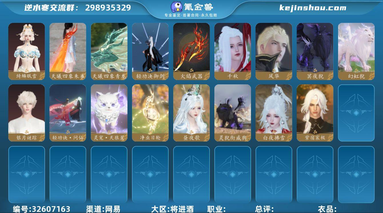 【已用天赏石29】天霓染4, 天赏发型5, 副本外观2, 馆藏7级, 灵韵5, 9国色, 268060衣品, 80530国色值, 193套时装, 详情见图;副本外观: 白夜拂雪, 紫宿宸极;天赏外观: 绮鳞眠雪, 银月谜踪, 昼夜歌, 风华, 千秋,火焰武器, 轻功诀问仙, 轻功诀御剑, 降魔破邪·金刚明王, 天曦四象·青龙, 天曦四象·朱雀;天赏祥瑞: 灵猊衔威舆, 幻虹猊, 冥夜猊;天赏灵宠: 灵宠·天狼星;武器环身: 照罪赦渊, 银甲霜锋, 振金雷, 渊墟深影, 天魔蛊主