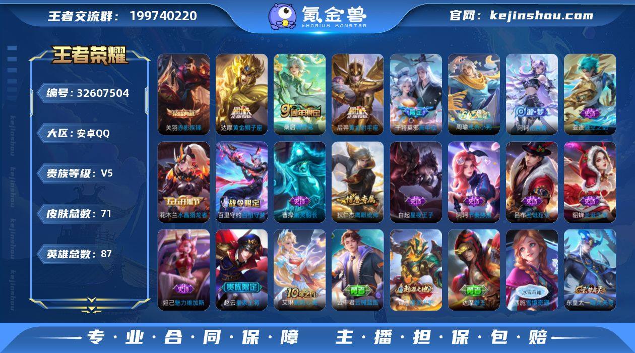 【XY936】贵族5/皮肤71/典藏1/传说4/史诗12/英雄87/赤影疾锋/鸣野蒿/画中仙/黄金狮子座/黄金射手座/阴阳师/皇家上将/海滩派对/胡桃夹子/噬灭天穹(s37)/谧流熔炉/虚灵犬护/破空之剑/神迹守卫/百相守梦-百里守约/百相守梦-老夫子/线条小狗-周瑜/化蝶舞/鹰眼统帅/节奏热浪/星夜王子/水晶猎龙者/幽灵船长/圣诞狂欢/魅力维加斯/圣诞恋歌/鹤鸣心笺/云械蓝图/浪漫序章/玫蓝誓约/景韶洛都/灵卦秘语/爆裂喵拳/金福满堂/雪境奇遇-西施/铁骨偃魂/苍林狼骑/逐霄战戟/雾都夜雨/功夫炙烤/次元傲视/次元突破/海滩丽影/阿尔法小队/万象初新/拳王/死亡骑士/黄金武士/少女阿狸/白色死神/忍·炎影/哥特玫瑰/碧珀绯影/启蛰/孤猎/秩序猎龙将/归虚梦演-蒙犽/海之征途/午夜歌剧院/尼罗河女神/美梦成真/龙域领主/第七人偶/星航指挥官/维京掠夺者/天启骑士/加勒比小姐/精灵王/帝国元帅/木偶奇遇记/福禄兄弟