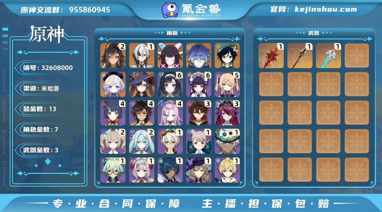 邮箱: 不送邮/死邮 总黄数: 13 冒险等级: 56 2命金色角色: 二命迪希雅 1命金色角色: 一命阿蕾奇诺 0命金色角色: 温迪,七七,莫娜,菲林斯,哥伦比娅 拥有武器: 天空之刃,贯虹之槊,赤月之形 1精武器: 天空之刃,贯虹之槊,赤月之形