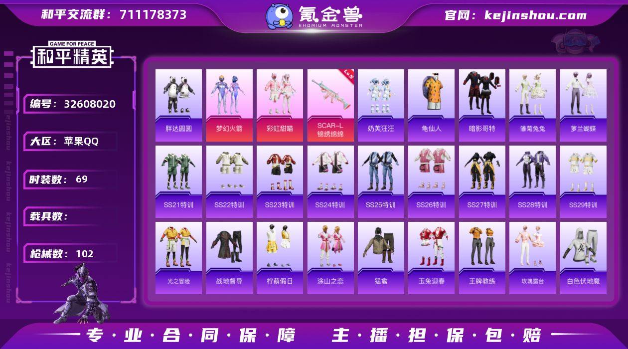 苹果 手Q-2粉装-1特效枪-0载具-1粉色飞行器-27517热力值-7王牌印记-69套装-102枪皮 【热门品类】:粉装-梦幻火箭,套装-胖达圆圆,套装-龟仙人,套装-暗影哥特 【粉色套装】:粉装-梦幻火箭,粉装-彩虹甜喵 【粉色枪皮等级】:SCAR-L-锦绣绵绵(五级) 【粉色枪皮】:SCAR-L-锦绣绵绵 【粉色飞行器】:镜光幻境飞行翼 【粉色降落伞】:梦幻火箭降落伞,垂柳戏鸭降落伞,第五大道降落伞,闲梦青缨降落伞,蜜语绒猫降落伞,精灵梦叶罗丽降落伞 【稀有套装】:套装-龟仙人,套装-雏菊兔兔,套装-萝兰蝴蝶 【稀有枪皮】:AKM-破晓战魂,AKM-龙的传人,M16A4-蓝色火焰,SCAR-L-是爱神辣,SCAR-L-炫彩节奏,SCAR-L-玉兔迎春,SCAR-L-甜蜜旋律,SCAR-L-红色方程式,M416-糯团青竹,GROZA-2B战斗服款,GROZA-懵萌河马,AUG-天降萌叽,AUG-耀粉歌者,M762-天降萌叽,G36C-懵萌河马,AC-VAL-天降萌叽,AC-VAL-快闪甜心,AC-VAL-闲梦青缨,蜜獾-天降萌叽,蜜獾-娇憨猪猪,UZI-啾咪啾咪,UZI-天降萌叽,UZI-娇憨猪猪,UMP45-涂山之恋,UMP45-炫光之旅,UMP45-生命誓言,Vector-焰鹰斗篷,Vector-生命誓言,汤姆逊-耀粉歌者,野牛-粉锦千层,P90-快闪甜心,Kar98K-彩虹符号,Kar98K-梦幻火箭...