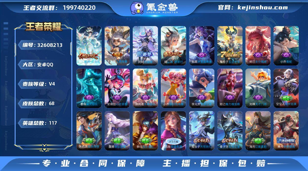 【精品小号·愿照众生和·飞鸢探春·山海碧波行·可二次】YXw21131-安卓Q-117英雄-68皮肤-0王者印记-150铭文-贵族积分0w【贵族4】【2传说·3按键】【因赛季更新游戏段付以上号为准!】 【英雄全皮】:空空儿全皮 【传说皮肤】:妲己愿照众生和,李元芳飞鸢探春 【限定皮肤】:姜子牙天穹之誓,狄仁杰阴阳师,狄仁杰万华元夜,项羽海滩派对,李元芳云中旅人,鬼谷子原初探秘者,鬼谷子五谷丰年,沈梦溪大漠名商,瑶山海碧波行,鲁班大师探海日志,桑启海盐诗旅,艾琳女武神,鬼谷子天穹祈灯,刘邦剑破天穹,周瑜熔金海岸 【年限皮肤】:瑶山海碧波行,妲己愿照众生和 【赛季限定】:鬼谷子原初探秘者,狄仁杰万华元夜,沈梦溪大漠名商,李元芳云中旅人,桑启海盐诗旅,鲁班大师探海日志,鬼谷子天穹祈灯,刘邦剑破天穹,姜子牙天穹之誓,太乙真人谧流熔炉 【史诗皮肤】:阿轲化蝶舞,瑶山海碧波行,鬼谷子五谷丰年,小乔青蛇,李元芳逐浪之夏,刘禅天才门将,安琪拉心灵骇客,小乔缤纷独角兽,曹操幽灵船长,妲己女仆咖啡,妲己魅力维加斯,孙尚香水果甜心,甄姬冰雪圆舞曲 【其他皮肤】:莱西奥踏浪烽翎,空空儿戏梦巡演,露娜命运加冕,戈娅玫蓝誓约,少司缘灵卦秘语,姜子牙星梦巡...