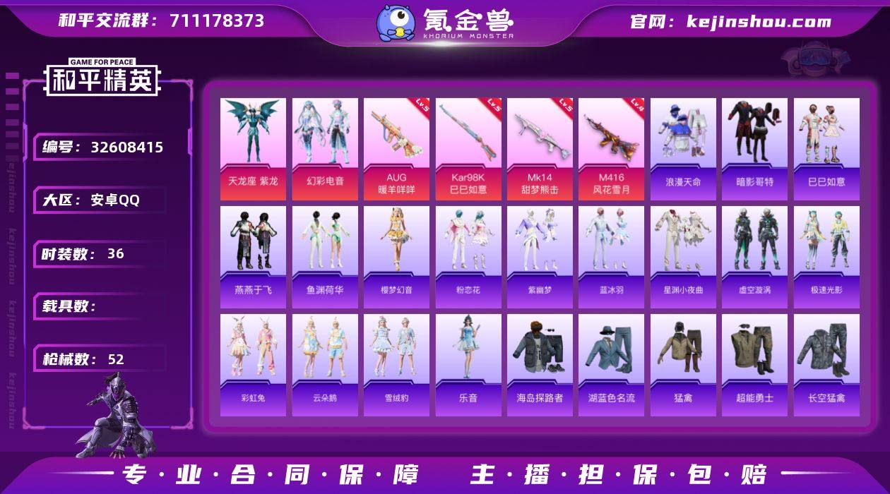 编号78713 未实名 等级47 36套装 52枪皮 历史最高18星 2王牌印记 1绝世 2传奇 2卓越 热力值15334 2粉4特效枪 4级M416-风花雪月 5级MK14-甜梦熊击 5级AUG-暖羊咩咩 5级Kar98K-巳巳如意 天龙座紫龙 暗影哥特 浪漫天命 彩虹兔 虚空漩涡 星渊小夜曲 粉恋花 鱼渊荷华  雪山 精英 套装-樱梦幻音 套装-紫幽梦 M762云朵鹅 桃粉嫣然3级头盔 六号稻