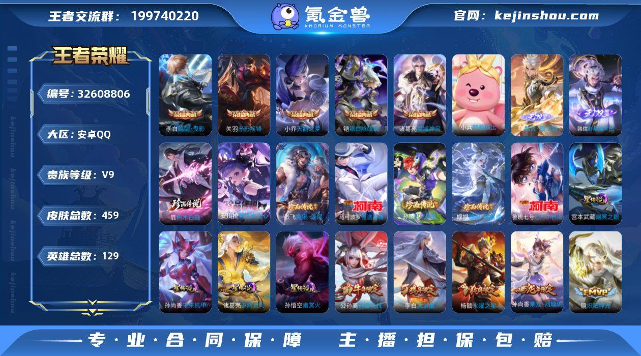 【精品推荐·5金标·天鹅之梦·鸣剑曳影·星域神启·赤影疾锋·银白咏叹调·神罪·器灵螭龙剑·群星魔术团·朽木白哉·酷洛米之心·兔狲蓬尾·器灵落星盏·孙策时之奇旅·江户川柯南·怪盗基德·岁雨灵司·愿照山河定·愿照众生和·冥王哈迪斯·前尘镜·祈雪灵祝·时雨天司·永曜之星】【可二次】w19900-安卓Q-129英雄-459皮肤-19王者印记-220铭文-贵族积分13w【贵族9】【6典藏·3无双·7珍品·4星传说·38传说·1天幕·19按键】【因赛季更新游戏段付以上号为准!】 【英雄全皮】:扁鹊全皮,孙权全皮,娜可露露全皮,鬼谷子全皮,苏烈全皮,敖隐全皮,蒙恬全皮,阿古朵全皮,空空儿全皮,影全皮,海诺全皮 【荣耀典藏】:武则天英雄,小乔天鹅之梦,李白鸣剑曳影,诸葛亮星域神启,关羽赤影疾锋,铠银白咏叹调 【无双皮肤】:铠神罪,曜器灵螭龙剑,韩信群星魔术团 【珍品传说】:暃朽木白哉,安琪拉酷洛米之心,张飞兔狲蓬尾,嫦娥器灵落星盏,孙策时之奇旅,鲁班七号江户川柯南,马可波罗怪盗基德 【星元皮肤】:宫本武藏幽冥之眼,孙悟空幽冥火,孙尚香未来机甲,诸葛亮岁雨灵司 【天幕】:共赏芳华天幕 【传说皮肤】:后羿神树通天,后羿千劫归真,司空震愿照山河定,女娲愿照千秋盛,妲己愿照众生和,澜...