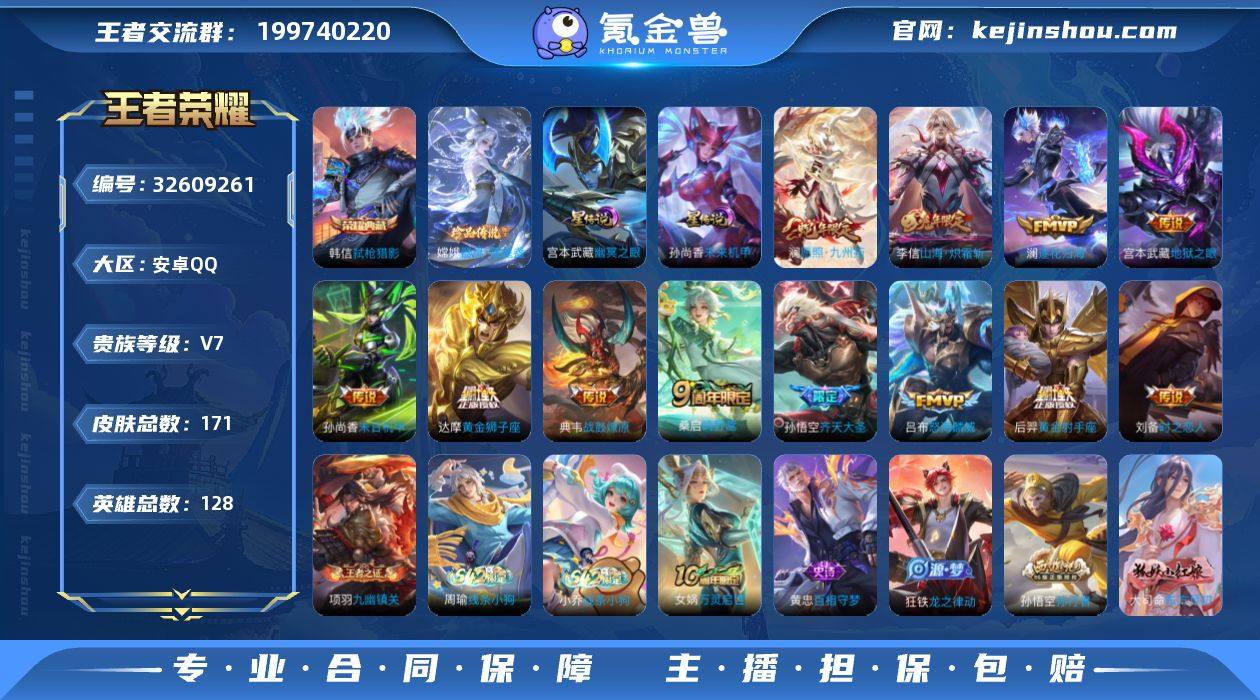 安卓Q-V7-最强王者段位-128英雄-171皮肤-1典藏皮肤-2珍品传说-13传说-46史诗【英雄全皮】:孙权全皮,敖隐全皮【荣耀典藏】:韩信弑枪猎影【珍品传说】:伽罗沧流箭,嫦娥器灵落星盏【传说皮肤】:狄仁杰神骥赴朔漠,澜愿照九州拓,桑启鸣野蒿,典韦战鼓燎原,澜逐花归海,孙悟空齐天大圣,李信山海炽霜斩,吕布怒海麟威,刘备时之恋人,达摩黄金狮子座,后羿黄金射手座,孙尚香末日机甲,宫本武藏地狱之眼【限定皮肤】:蒙犽顽岩魄,蔡文姬夏日便利店,虞姬夏日便利店,姜子牙天穹之誓,狄仁杰阴阳师,赵云皇家上将,孙尚香蔷薇恋人,元歌无心,马可波罗山海玄木吟,狄仁杰魔术师,项羽海滩派对,兰陵王金庭之子,孙悟空孙行者,孙悟空齐天大圣,李元芳云中旅人,杨戬潮玩骑兵,鬼谷子五谷丰年,百里玄策原初追逐者,沈梦溪大漠名商,裴擒虎李小龙,裴擒虎擒涛扼浪,李信山海炽霜斩,鲁班大师探海日志,桑启海盐诗旅,张良古海寻踪,鬼谷子天穹祈灯,姬小满妄想食味,沈梦溪龙舞盛年,刘邦剑破天穹,程咬金群星魔术团,周瑜熔金海岸【年限皮肤】:李信山海炽霜斩,马可波罗山海玄木吟,澜愿照九州拓【赛季限定】:兰陵王金庭之子,沈梦溪大漠名商,李元芳云中旅人,桑启海盐...