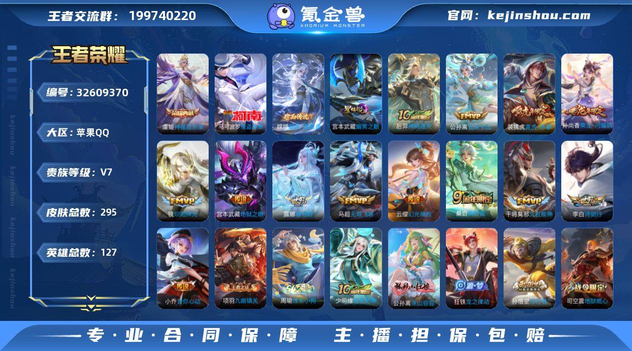苹果Q-295皮肤-1典藏皮肤-2珍品传说-13传说-85史诗 【英雄全皮】:戈娅全皮,海诺全皮 【荣耀典藏】:虞姬神鉴启示录 【珍品传说】:嫦娥器灵落星盏,马可波罗怪盗基德 【传说皮肤】:后羿神树通天,公孙离云诺千山,云缨幻光神枪,桑启鸣野蒿,孙尚香乘龙问璇玑,露娜霜月吟,李白诗剑行,马超无双飞将,裴擒虎寅虎赤拳,小乔音你心动,镜炽阳神光,干将莫邪久胜战神,宫本武藏地狱之眼 【限定皮肤】:白起狰,姜子牙天穹之誓,狄仁杰阴阳师,小乔纯白花嫁,廉颇寅虎御盾,赵云皇家上将,墨子神迹守卫,孙尚香蔷薇恋人,庄周云端筑梦师,庄周高山流水,夏侯惇朔风刀,马可波罗暗影游猎,狄仁杰魔术师,狄仁杰万华元夜,达摩沙漠行僧,项羽海滩派对,老夫子醍醐杖,老夫子航海奇遇记,程咬金演武夺筹,兰陵王金庭之子,孙悟空孙行者,牛魔御旌,后羿圣弓游侠,李元芳云中旅人,虞姬霸王别姬,钟馗驱傩正仪,干将莫邪胡桃夹子,干将莫邪真爱魔法,雅典娜黎明之约,蔡文姬繁星吟游,鬼谷子原初探秘者,鬼谷子五谷丰年,苏烈千军破阵,百里玄策原初追逐者,弈星混沌棋,梦奇顽趣,公孙离蜜橘之夏,公孙离玉兔公主,沈梦溪大漠名商,明世隐疑决卦,裴擒虎李小龙,裴擒虎寅虎赤拳,...