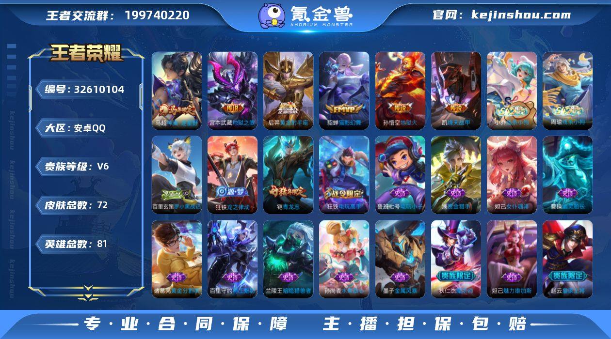 安卓Q-V6-最强王者段位-81英雄-72皮肤-6传说-17史诗 【英雄全皮】:敖隐全皮 【传说皮肤】:马超神骥逐星野,铠绛天战甲,貂蝉猫影幻舞,后羿黄金射手座,宫本武藏地狱之眼,孙悟空地狱火 【限定皮肤】:狄仁杰阴阳师,赵云皇家上将,狄仁杰魔术师,狄仁杰万华元夜,达摩沙漠行僧,项羽海滩派对,程咬金演武夺筹,王昭君午后时光,兰陵王金庭之子,李元芳云中旅人,鬼谷子原初探秘者,铠青龙志,苏烈千军破阵,沈梦溪大漠名商,狂铁电玩高手,鲁班大师探海日志,桑启海盐诗旅,张良古海寻踪,妲己灵卜魔法 【年限皮肤】:铠青龙志 【赛季限定】:鬼谷子原初探秘者,狄仁杰万华元夜,程咬金演武夺筹,苏烈千军破阵,达摩沙漠行僧,兰陵王金庭之子,沈梦溪大漠名商,李元芳云中旅人,桑启海盐诗旅,鲁班大师探海日志,张良古海寻踪 【战令限定】:狂铁电玩高手,王昭君午后时光,妲己灵卜魔法,周瑜线条小狗,小乔线条小狗 【史诗皮肤】:周瑜线条小狗,小乔线条小狗,百里玄策罗小黑战记,狂铁龙之律动,妲己灵卜魔法,狂铁电玩高手,澜赏金猎手,铠青龙志,百里守约特工魅影,诸葛亮黄金分割率,兰陵王暗隐猎兽者,曹操幽灵船长,墨子金属风暴,妲己女仆咖啡,妲己魅力维加斯...