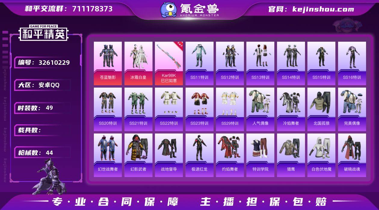 【FK6550】49套装/枪械1/装备41/战备35/热力值15058/一级Kar98K-巳巳如意/苍蓝魅影/冰霜白皇/Kar98K-巳巳如意/炫紫旋律降落伞/机甲封神降落伞/红伞翩翩降落伞/AKM-夜灯/M16A4-幻世战舞者/SCAR-L-粉色回忆/SCAR-L-繁花小夜曲/M416-红色方程式/AUG-焰龙焚天/QBZ-电玩视界/AC-VAL-天降萌叽/UMP45-绒宝小鹅/Vector-彩虹符号/Vector-生命誓言/汤姆逊-耀粉歌者/MP5K-蓝莓炮弹/Kar98K-彩虹符号/Kar98K-魅影蝠王/VSS-粉色回忆/Mini14-海渊国主/莫辛纳甘-银碳小老虎/S686-生命誓言/S686-魔法学院/S686-千金淑猫/S1897-红伞翩翩/S12K-童趣迷兔/S12K-音爆索尼克/S12K-幻世战舞者/SS11特训/SS12特训/SS13特训/SS14特训/SS15特训/SS16特训/SS20特训/SS21特训/SS22特训/SS23特训/SS29特训/人气偶像/冷焰舞者/北国孤狼/完美偶像/幻世战舞者/幻影武者/战地督导/极速红龙/灼焰舞者/特训学院/猎鹰/白色伏地魔/破晓战魂/破蛋小黄鸡/竞技名士/竞技达人朋克/绮丽涂鸦/缤纷果语/耀眼新星/耀粉歌者/萌黄之夏/蓝彩潮人/蓝色运动/街头潮人/都市魅力/长空猛禽/骑行爱好者/魅力单车/麻辣教官/黄色伏地魔/黄色运动/黑色伏地魔/精灵迷巫背包(1级)