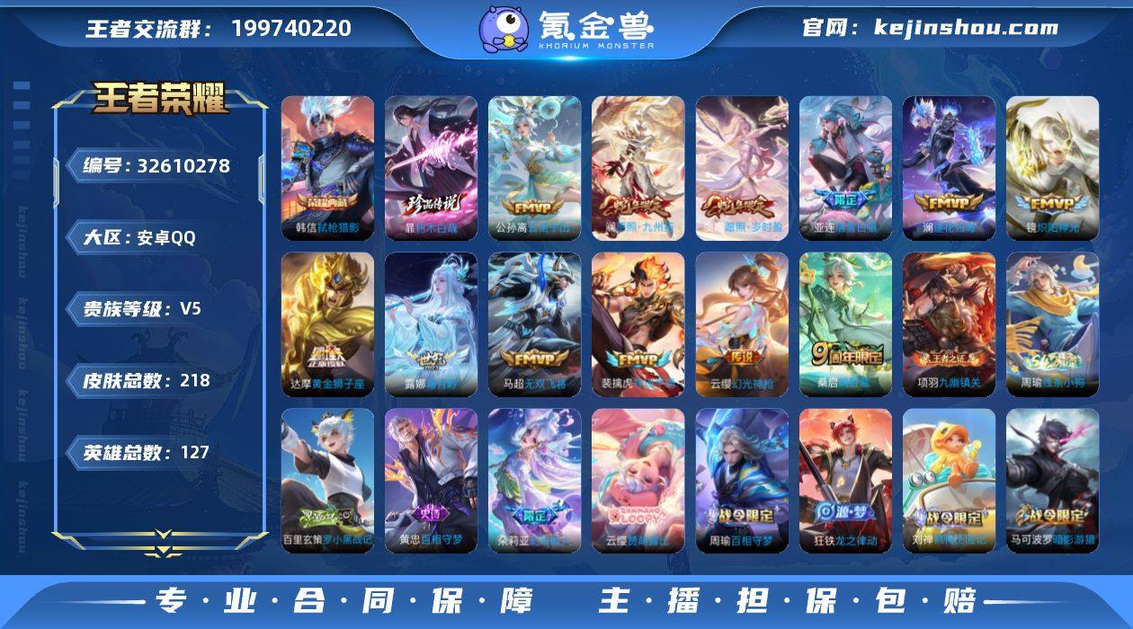 贵族7-金标铠、澜、橘右京、露娜、裴擒虎-218皮-1典藏-1珍品传说-12传说-3全皮英雄 安卓手Q314区 营地ID1762859731最强王者【珍品传说皮肤】:朽木白哉【荣耀典藏】:弑枪猎影【优质限定皮肤】:无双飞将【传说皮肤】:落雪白狼,祥瑞亨通,云诺千山,愿照·岁时盈,黄金狮子座,幻光神枪,无双飞将,愿照·九州拓,逐花归海,霜月吟,鸣野蒿,炽阳神光【史诗皮肤】:节奏热浪,九幽镇关,罗小黑战记,地狱岩魂,云间偶戏,百相守梦,幻珠鲛人,赞萌露比,百相守梦,天秀·启明,鸭鸭历险记,龙之律动,化蝶舞,暗影游猎,山海·玄木吟,茶境仙,特工魅影,器灵·浮梦炉,原初追逐者,逐浪之夏,星界战将,乱世虎臣,幽灵船长,猫狗日记,魅语,魔术师,百相守梦,暗隐猎兽者,心灵骇客,银河之约,破空之剑,鬼剑武藏,皇家上将,紫霞仙子,水晶猎龙者,时之恋人,摇滚巨星,赏金猎手,蔷薇恋人,天才门将,圣诞狂欢,星夜王子,曙光守护者,修罗,末日机甲,无心,水果甜心,五谷丰年,鹰眼统帅,魅力维加斯