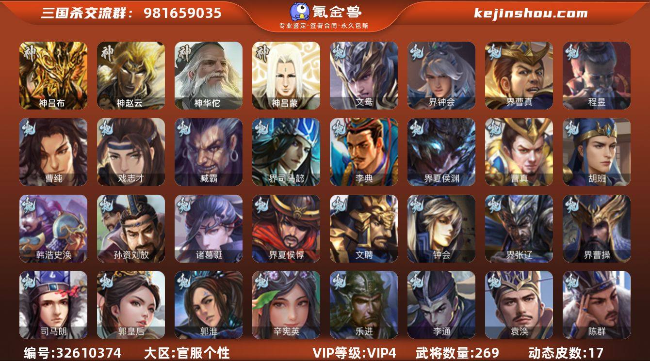 【14789733】官阶:骠骑将军;VIP等级:VIP4;史诗武将数量:28;动态皮肤数量:17;武将总数:269;史诗宝珠数量:1;将魂数量:1948;神将:3;魏国史诗武将:8;蜀国史诗武将:9;吴国史诗武将:4;群史诗武将:8