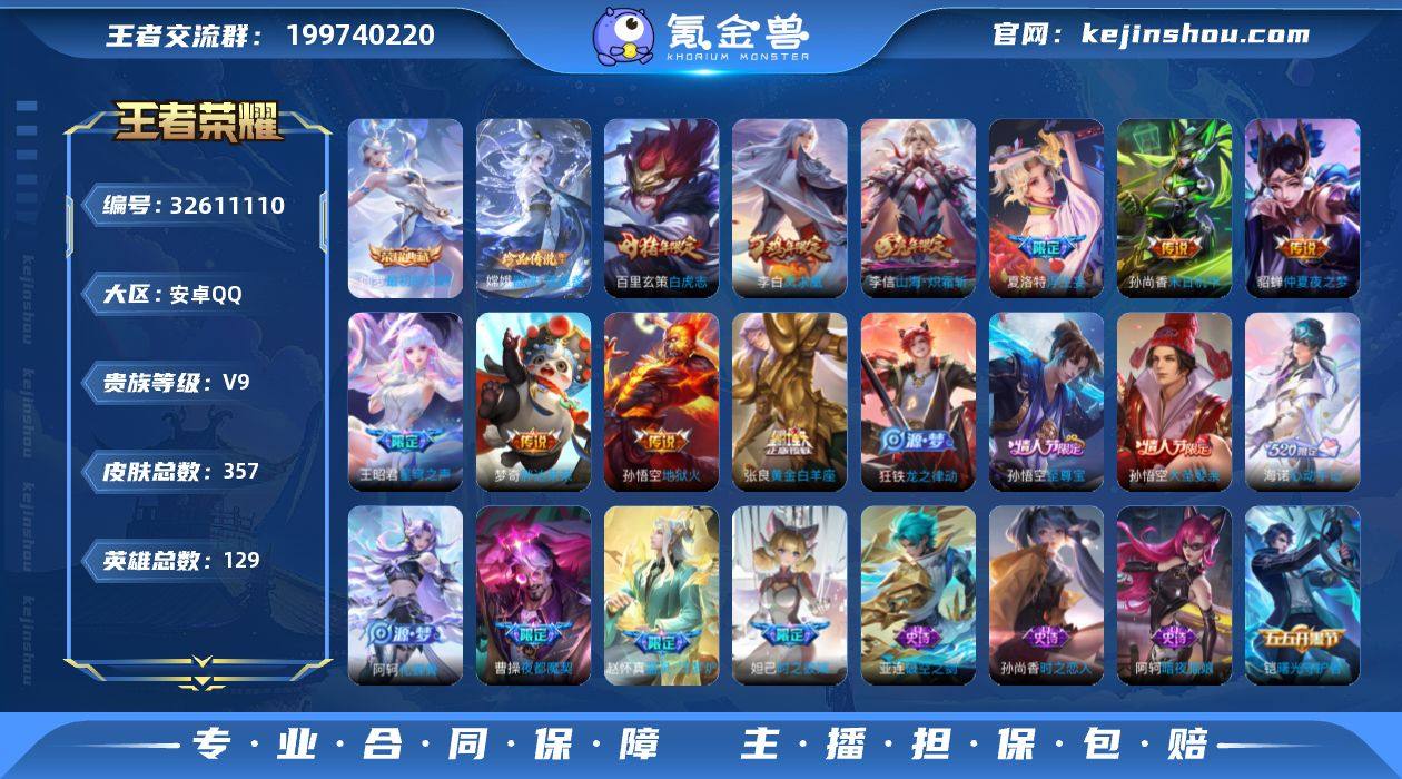 贵族9/皮肤357/典藏1/传说23/史诗98/英雄129/孙权全皮/梦奇全皮/敖隐全皮/夏洛特全皮/空空儿全皮/海诺全皮/武则天/伽罗-最初的交响/李信问心剑/孙悟空无相/伽罗沧流箭/嫦娥-器灵·落星盏/阿轲罗刹妄海/韩信踏浪归/云缨神骥越千峰/关羽神骥镇沧海/朵莉亚神骥鸣幻洲/狄仁杰神骥赴朔漠/貂蝉神骥聚万邦/马超神骥逐星野/李元芳星君娄金/花木兰异界灵契/王昭君长夜焕生/桑启-鸣野蒿/夏洛特-浮生妄/李信-山海·炽霜斩/王昭君-星穹之声/虞姬-启明星使/张良-黄金白羊座/百里玄策-白虎志/梦奇-胖达荣荣/貂蝉-仲夏夜之梦/李白-凤求凰/孙尚香-末日机甲/孙悟空-地狱火/白起-狰/暃-埋骨钱/姜子牙-天穹之誓/狄仁杰-阴阳师/虞姬-凯尔特女王/赵云-皇家上将/墨子-神迹守卫/妲己-时之彼端/嬴政-优雅恋人/嬴政-白昼王子/孙尚香-蔷薇恋人/鲁班七号-狮舞东方/庄周-高山流水/高渐离-死亡摇滚/阿轲-迷踪丽影/扁鹊-奇幻香踪/芈月-重明/吕布-猎兽之王/周瑜-赤莲之焰/元歌-云间偶戏/元歌-无心/夏侯惇-朔风刀/甄姬-游园惊梦/曹操-烛龙/典韦-穷奇/典韦-蓝屏警告/马可波罗-暗影游猎/狄仁杰-魔术师/狄仁杰-万华元夜/达摩-星际陆战队/达摩-沙漠行僧/项羽-海滩派对/老夫子-醍醐杖/老夫子-航海奇遇记/程咬金-演武夺...