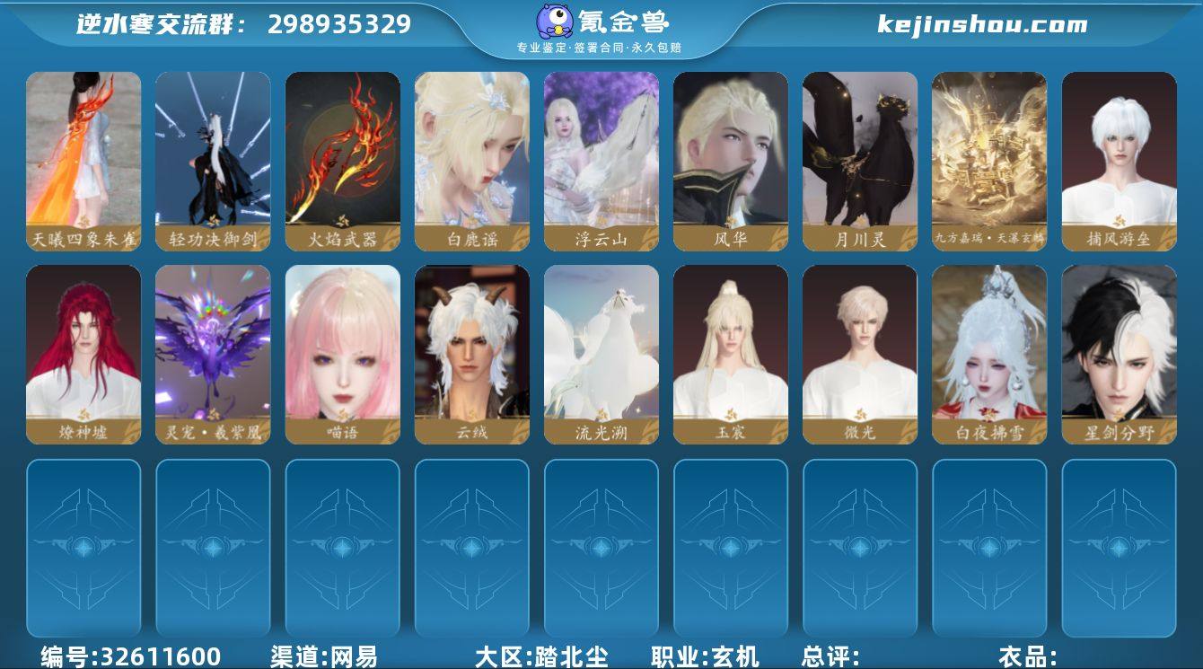 【已用天赏32-未用1】, 天霓染5, 天赏发型10, 副本外观3, 馆藏7级, 灵韵7, 10国色, 297250衣品, 92335国色值, 未用天赏石, 215套时装, 详情见图;副本外观: 白夜拂雪*2, 星剑分野;天赏外观: 浮云山, 雾中曲, 白鹿谣, 捕风游垒, 燎神墟, 云绒, 喵语, 风华,狱火武器, 火焰武器, 轻功诀御剑, 天曦四象·朱雀,九方嘉瑞·天瀑玄鳞;转盘外观:玉宸, 微光;天赏祥瑞: 流光溯, 月川灵;天赏灵宠: 灵宠·羲紫凰;武器环身: 剑渡东海, 振金雷, 临渊一梦