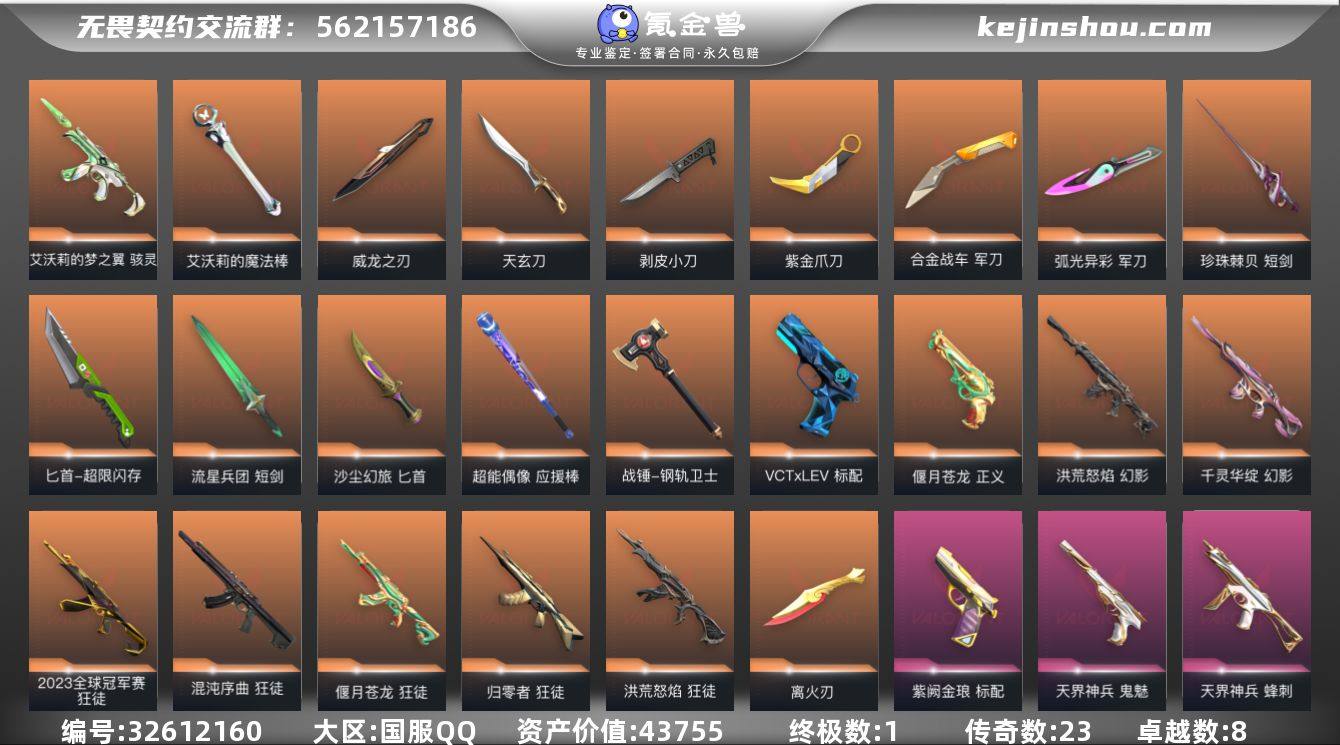 段位: 未定级 亮点皮肤: 离火刃,狂徒-2023全球冠军赛 套装: 天界神兵套装 近战武器皮肤: 军刀-合金战车,军刀-弧光异彩,天玄刀-天界神兵,匕首-沙尘幻旅,剥皮小刀-异形猎人,紫金爪刀-紫阙金琅//2.0,威龙之刃-耀鳞威龙,短剑-珍珠棘贝,军刀-流星军团错误,艾沃莉的魔法棒,超能偶像 应援棒,短剑-流星兵团,战锤-钢轨卫士,匕首-超限闪存 步枪皮肤: 狂徒-紫阙金琅,狂徒-盖亚的复仇,狂徒-偃月苍龙,幻影-侦察力量,狂徒-归零者,戍卫-天界神兵,幻影-洪荒怒焰,狂徒-洪荒怒焰,幻影-千灵华绽,狂徒-混沌序曲 佩枪皮肤: 标配-紫阙金琅,正义-偃月苍龙,鬼魅-天界神兵,标配-VCTxLEV 狙击枪皮肤: 飞将-天界神兵 冲锋枪皮肤: 蜂刺-天界神兵,骇灵-艾沃莉的梦之翼 亮点: 【优质装备】:天界神兵套装,离火刃,狂徒-2023全球冠军赛,狂徒-归零者,幻影-千灵华绽,狂徒-混沌序曲,狂徒-紫阙金琅,狂徒-盖亚的复仇,狂徒-偃月苍龙,正义-偃月苍龙,幻影-侦察力量,幻影-洪荒怒焰,狂徒-洪荒怒焰,骇灵-艾沃莉的梦之翼,标配-紫阙金琅,军刀-合金战车,鬼魅-天界神兵,戍卫-天界神兵,飞将-天界神兵,天玄刀,剥皮小刀,紫金爪刀,威龙之刃,艾沃莉的魔法棒,匕首-超限闪存